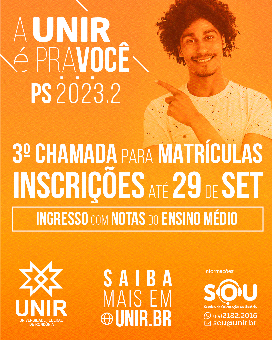 A Universidade Federal de Rondônia (UNIR) publicou nesta quarta-feira (20) a 3ª Chamada para Matrículas - acesse aqui a 3ª Chamada, e aqui a retificação da 3ª Chamada - aos cursos com entrada no segundo semestre letivo de 2023, que começa no próximo dia 30 de outubro. Desta vez estão sendo convocados, ao mesmo tempo, candidatos que concorreram no PS UNIR 2023 utilizando suas notas do Enem e que manifestaram interesse nas vagas, como também estão sendo convocados candidatos que se inscreveram utilizando as notas do Ensino Médio.