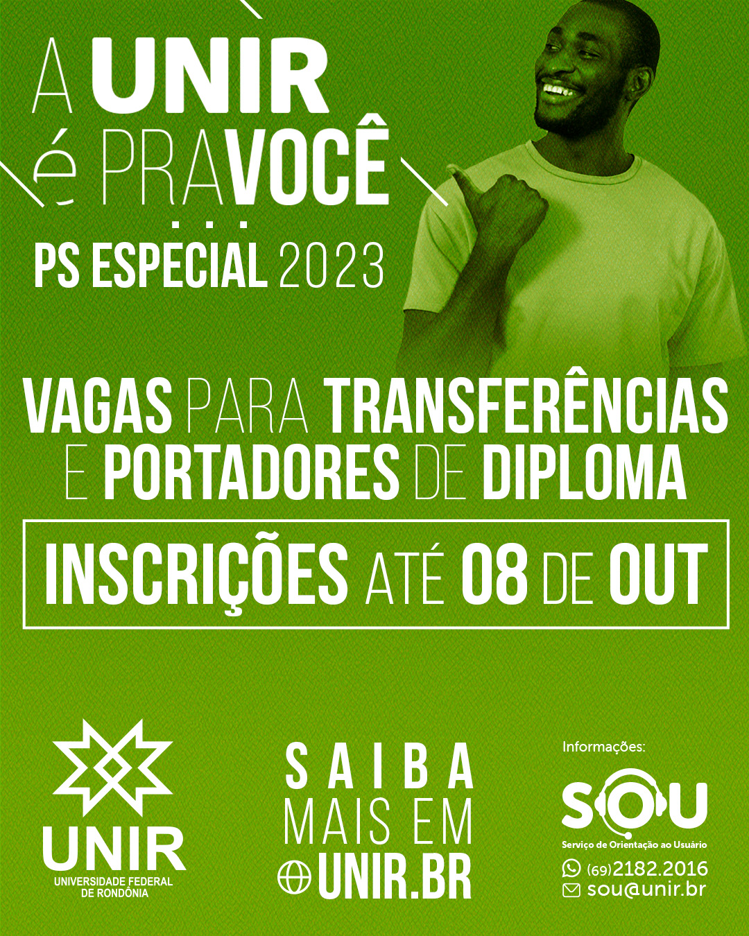 SOU - Serviço de Orientação ao Usuário – Mais informações sobre o PS Especial UNIR 2023, e mesmo auxílios para as inscrições, podem ser obtidos por meio do Serviço de Orientação ao Usuário, o SOU UNIR. Para isso podem ser enviados e-mails para o endereço sou@unir.br ou mensagens por WhatsApp para o número (69) 2182-2016.