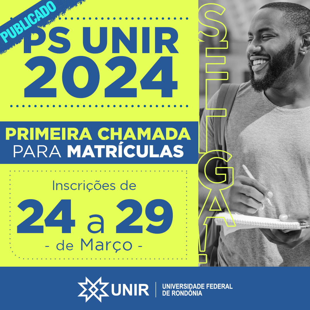 Período de matrícula - As matrículas dos candidatos convocados em primeira chamada para os cursos que começam no primeiro semestre letivo 2024 devem ser realizadas a partir do dia 24 de março até às 18h do dia 29 de março, exclusivamente de modo online, por meio do link https://sistemas.unir.br/discente/. Todos os documentos necessários para realização das matrículas estão especificados no edital de convocação. O prazo de matrículas foi estendido em um dia além do inicialmente previsto no cronograma, a fim de garantir mais tempo a todos os convocados.