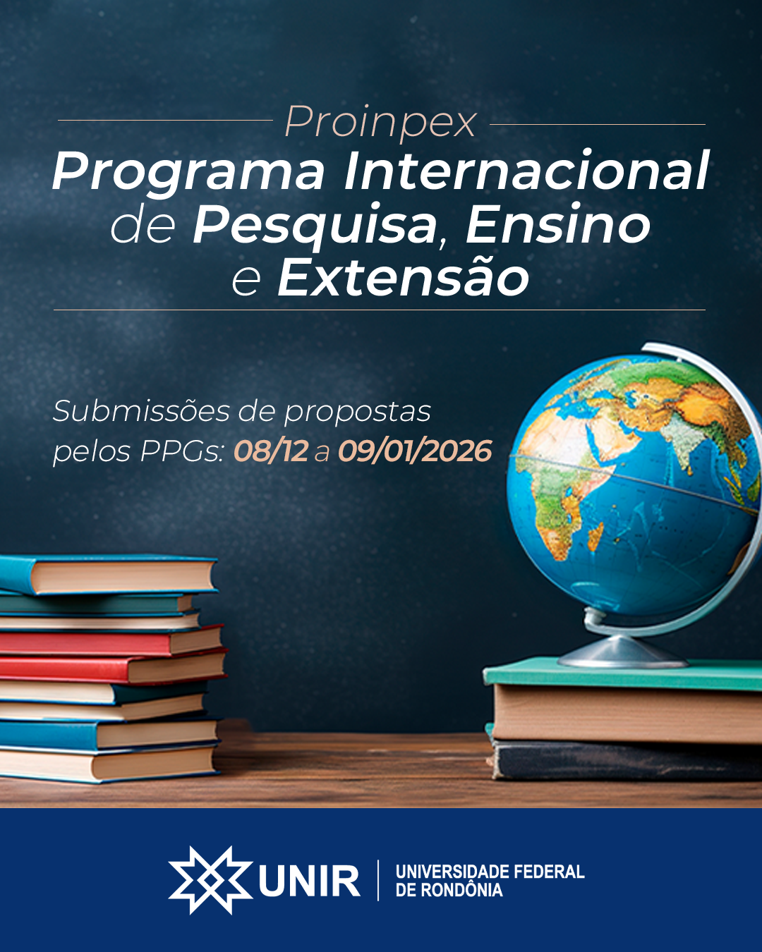 A Universidade Federal de Rondônia (UNIR), por meio da Assessoria de Relações Internacionais (ARI), publicou o edital do Proinpex 2025 - Programa Internacional de Pesquisa, Ensino e Extensão (acesse aqui), que vai selecionar seis propostas de docentes da pós-graduação para ações de intern|acionalização. O investimento total é de R$ 200 mil, e o objetivo é fomentar ações acadêmicas voltadas à internacionalização, interdisciplinaridade e à integração entre ensino, pesquisa e extensão.