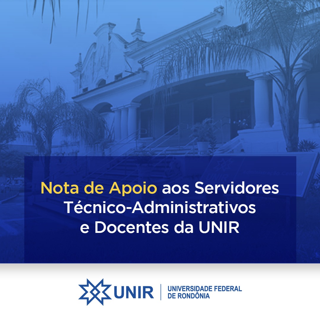 À comunidade em geral e aos usuários dos serviços da UNIR, reiteramos o compromisso e a estreita observação de todos os direitos de estudantes de graduação e pós-graduação, e o compromisso com todas as pessoas que estão envolvidas com as diversas e distintas ações desenvolvidas pela Universidade, de maneira a reduzir os impactos do justo movimento realizado por Técnicos-Administrativos em Educação e Docentes.