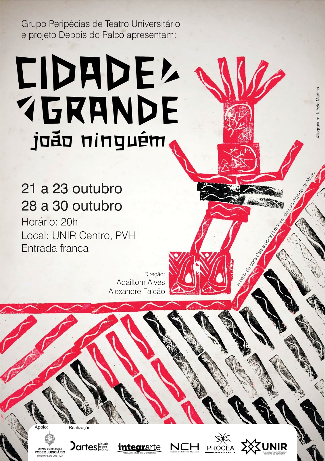 O espetáculo CIDADE GRANDE, joão ninguém, criado em oficina oferecida pelo Grupo Peripécias de Teatro Universitário, ligado ao Curso de Licenciatura em Teatro da Fundação Universidade Federal de Rondônia (UNIR), realiza temporada de estreia na UNIR-Centro, nos dias 21, 22, 23, 28, 29 e 30 de outubro, sempre às 20 horas.