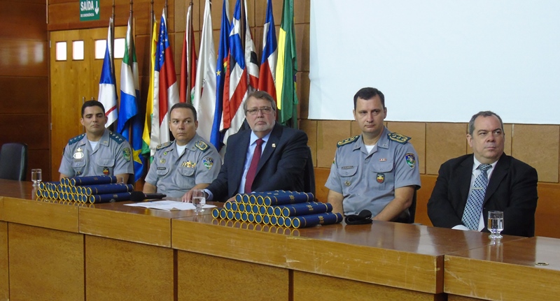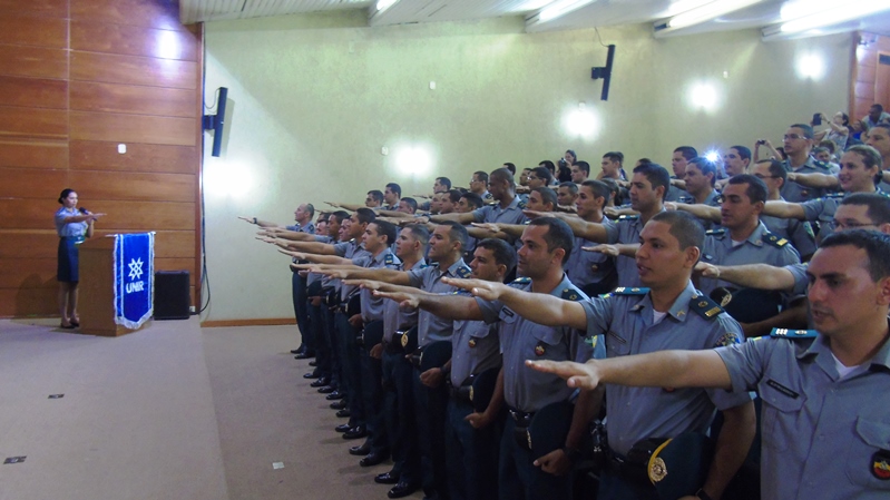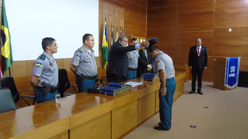 A cerimônia de colação de grau foi realizada no auditório do Tribunal de Contas de Rondônia (TCE/RO) e contou com a participação de autoridades e de familiares e amigos dos formandos. A mesa de cerimônia foi composta pelo reitor pro tempore da UNIR, professor doutor Ari Miguel Teixeira Ott, pelo coordenador do Curso de Segurança Pública, professor doutor Marcus Vinicius Rivoiro, pelo comandante geral da PM/RO, coronel Ênedy Dias de Araújo, pelo subcomandante geral da PM/RO, coronel Clairton Pereira da Silva, e pelo coordenador do Curso de Formação de Oficiais (CFO) da PM/RO, capitão Agleydson Rodrigues Cavalcante.