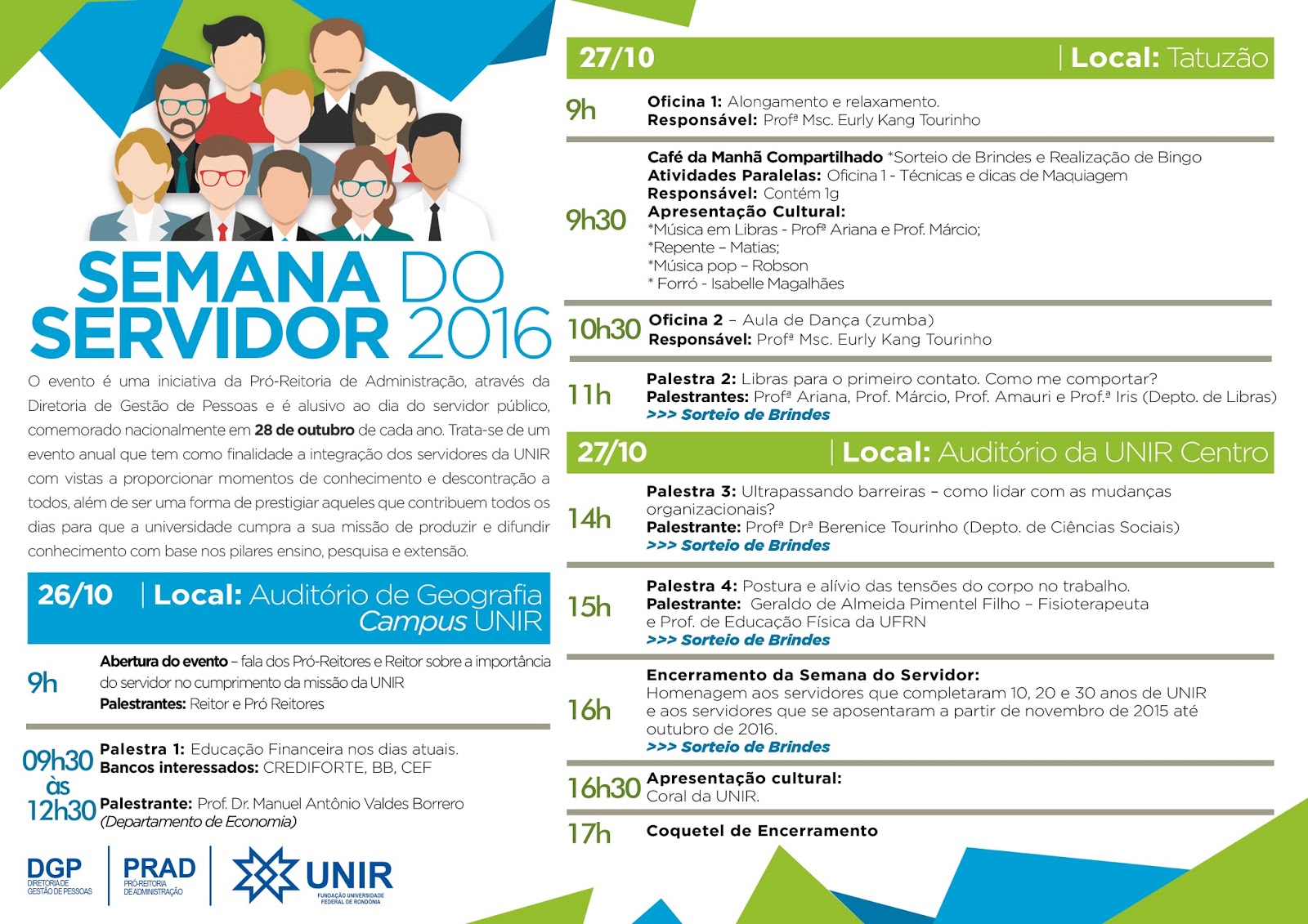 A Pró-Reitoria de Administração (PRAD), por meio da Diretoria de Gestão de Pessoas, promoverá a Semana do Servidor 2016, alusivo ao dia do servidor público, comemorado nacionalmente no dia 28 de outubro.