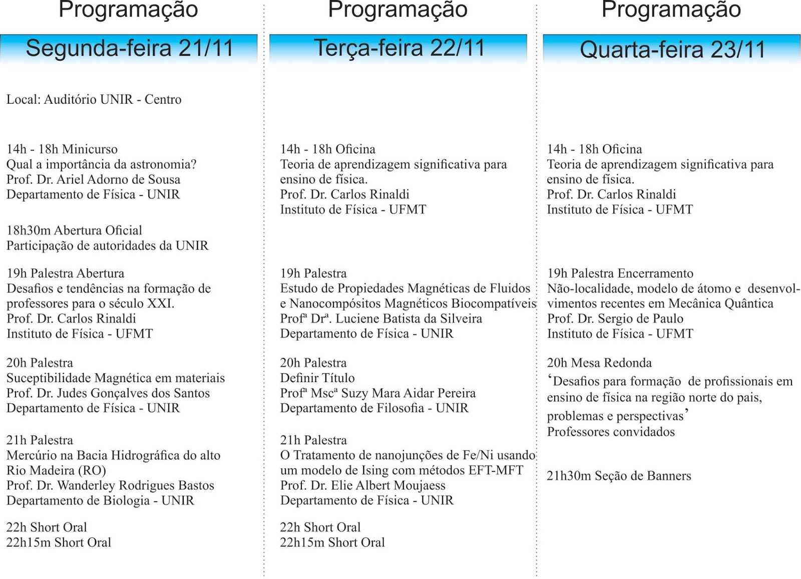 O Departamento de Física da Fundação Universidade Federal de Rondônia (UNIR) promoverá o V Encontro de Física de Rondônia (V EFRO) e VI Mostra de trabalhos acadêmicos do Curso de Física no período de 21 a 23 de novembro de 2016, no Auditório da UNIR-Centro, em Porto Velho. As inscrições devem ser feitas no endereço https://sites.google.com/site/vefro2016.