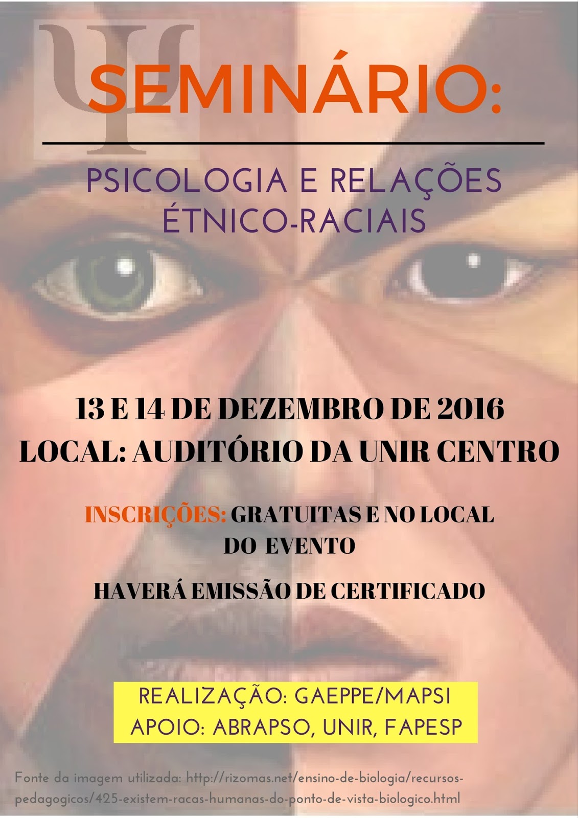 O Grupo Amazônico de Estudos e Pesquisas em Psicologia e Educação (GAEPPE) e o Mestrado Acadêmico em Psicologia (MAPSI) da Fundação Universidade Federal de Rondônia (UNIR), com o apoio da Associação Brasileira de Psicologia Social (ABRAPSO) e da Fundação de Amparo à Pesquisa de São Paulo (FAPESP), promovem o Seminário Psicologia e Relações Étnico-Raciais.