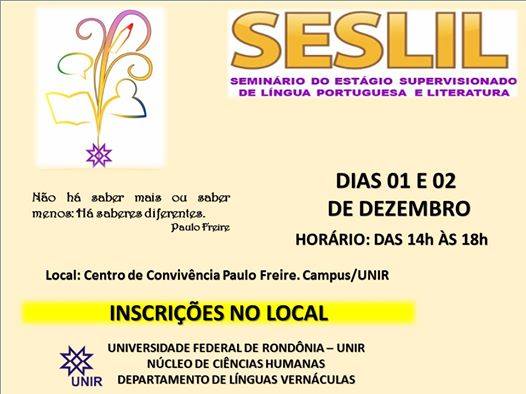 O Departamento de Línguas Vernáculas (DLV) e o Centro de Estudos da Linguagem (CEL) da Fundação Universidade Federal de Rondônia (UNIR) promovem o I Seminário do Estágio Supervisionado de Língua Portuguesa e Literatura (SESLIL).