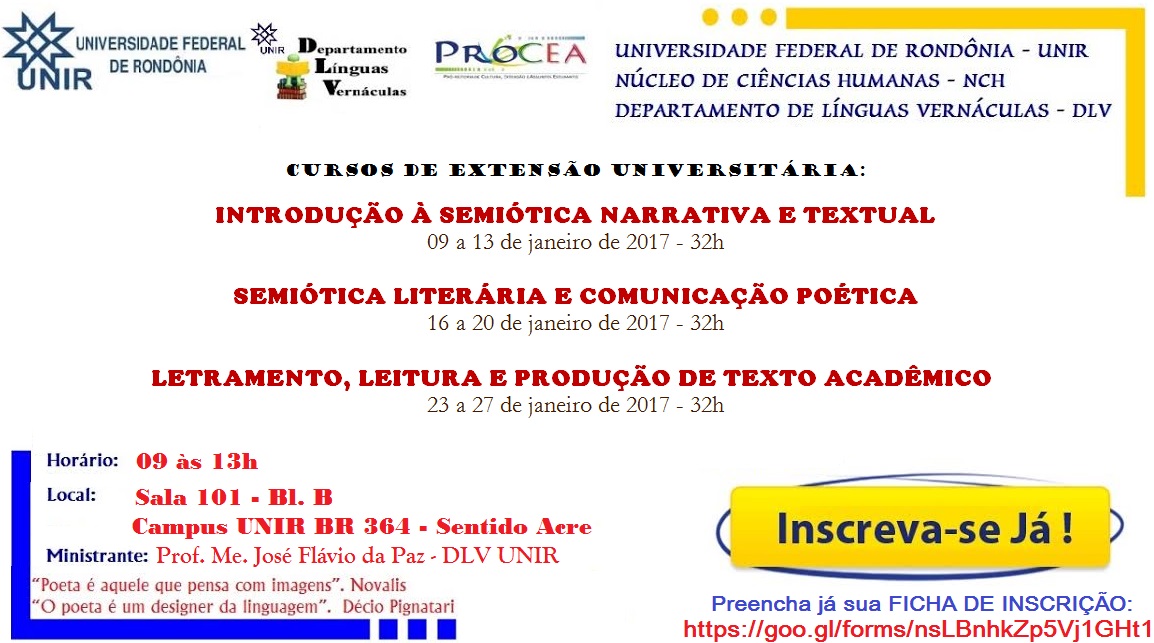 - Semiótica Literária e Comunicação Poética, que acontecerá no período de 16 a 20 de janeiro de 2017, com carga horária de 32h; e