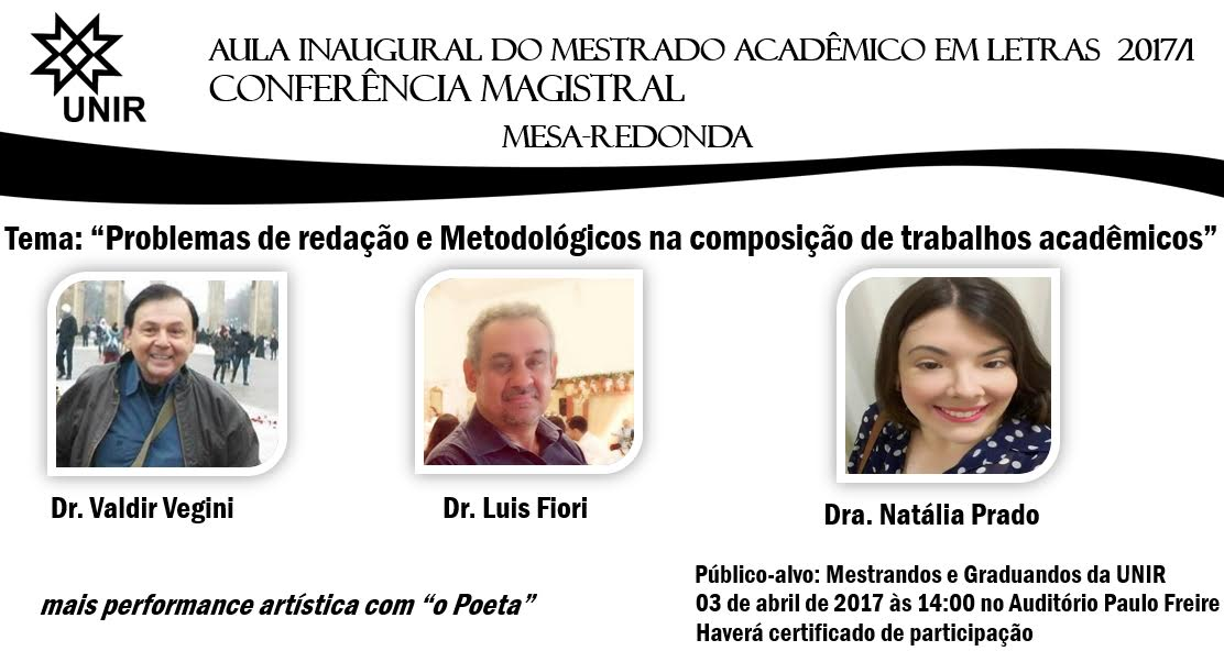 A coordenação do Mestrado Acadêmico em Letras da Fundação Universidade Federal de Rondônia (UNIR) promoverá a aula inaugural do curso no dia 3 de abril, às 14h, no Auditório Paulo Freire. O tema será “Problemas de redação e Metodológicos na composição de trabalhos científicos”.