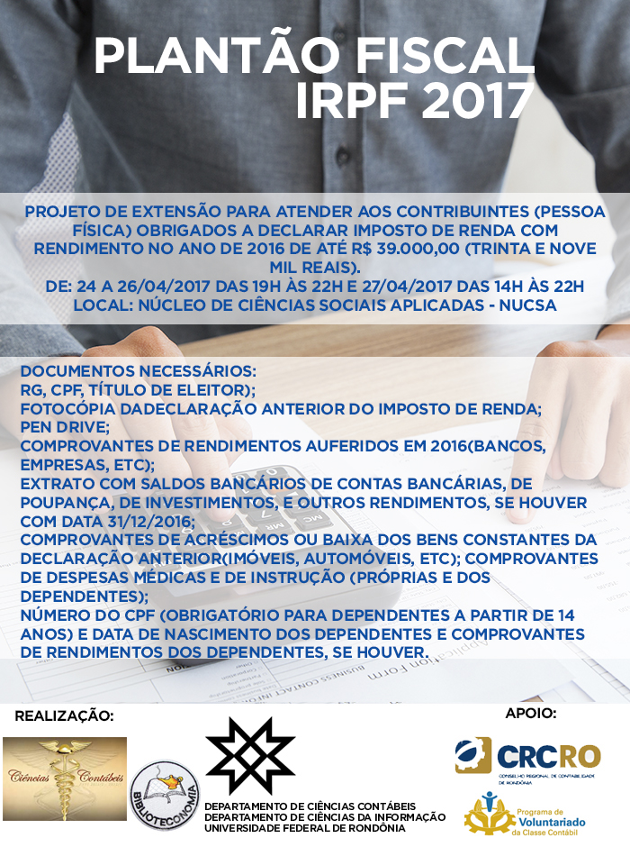 Os Departamentos de Ciências Contábeis e de Ciência a Informação da Fundação Universidade Federal de Rondônia (UNIR) promoverão, no período de 24 a 27 de abril, a terceira edição do Plantão Fiscal IRPF – 2017 para atender aos contribuintes (pessoa física) obrigados a declarar o Imposto de Renda Pessoa Física 2017. O projeto é destinado aos contribuintes (pessoa física) que tiveram renda de até R$ 39 mil no ano de 2016.