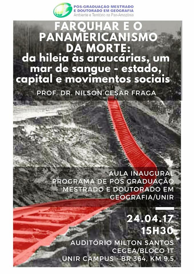 A coordenação do Programa de Pós-Graduação em Geografia (PPGG) da Fundação Universidade Federal de Rondônia (UNIR) promoverá a aula inaugural dos Cursos de Mestrado e de Doutorado em Geografia das turmas de 2017, com o tema “Farquhar e o Panamericanismo da morte: da hileia às araucárias, um mar de sangue – estado, capital e movimentos sociais”. A aula inaugural será ministrada pelo professor doutor Nilson Cesar Fraga, da Universidade Estadual de Londrina (UEL), no dia 24 de abril de 2017, às 15h30, no Auditório Milton Santos, situado no Prédio do CEGEA, Bloco 1T, no campus de Porto Velho.