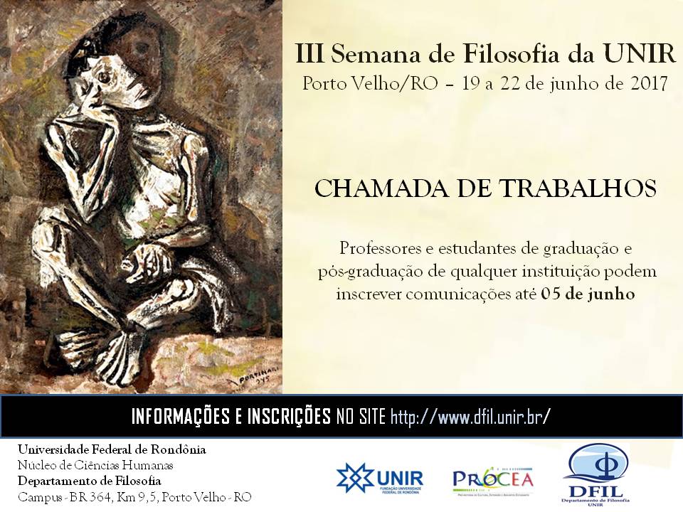 O Departamento de Filosofia da Fundação Universidade Federal de Rondônia (UNIR) promove, no período de 19 a 22 de junho de 2017, a III Semana de Filosofia da UNIR.