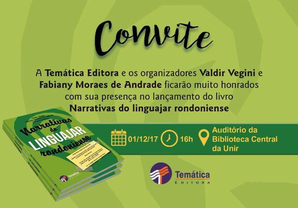 O lançamento do livro Narrativas do Linguajar Rondoniense acontecerá no dia 1º de dezembro, a partir das 16 horas, no auditório da Biblioteca Central da Universidade Federal de Rondônia (UNIR)