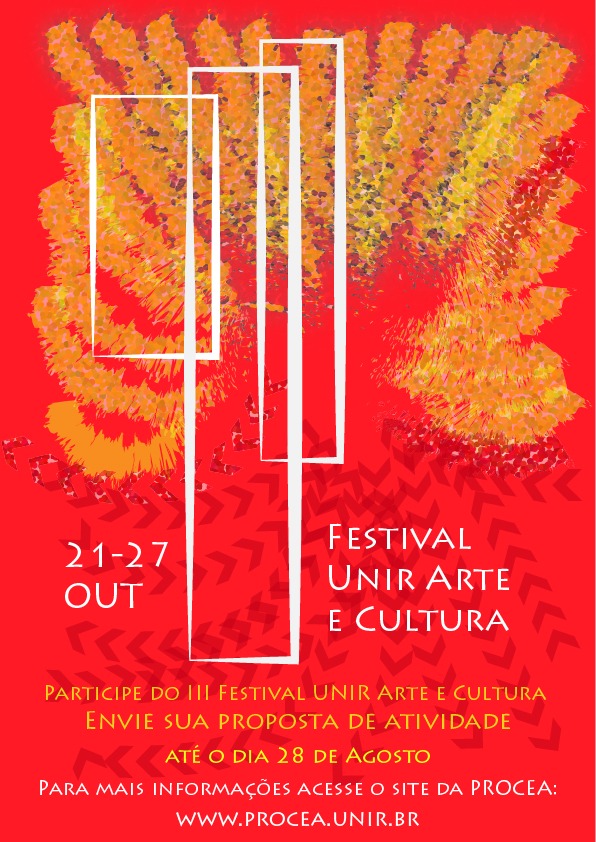 A Pró-Reitoria de Cultura, Extensão e Assuntos Estudantis (PROCEA) da Fundação Universidade Federal de Rondônia (UNIR) torna pública a Chamada para a composição da programação do III Festival UNIR Arte e Cultura, com o objetivo de integrar suas ações à comunidade acadêmica e à sociedade em geral. O Festival tem sua programação prevista para o período de 21 a 27 de outubro de 2017.