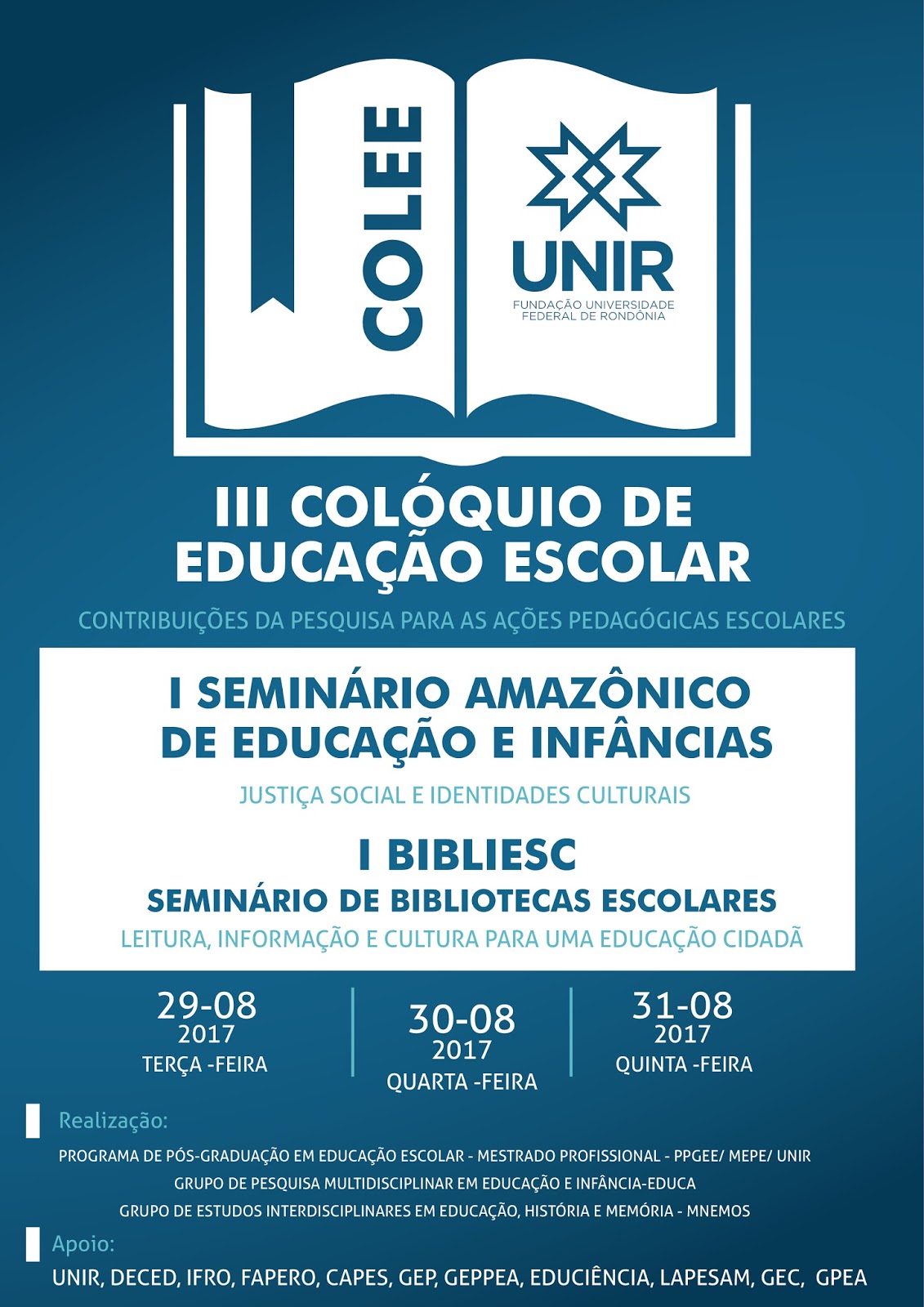 Estão abertas até o dia 20 de agosto de 2017 as inscrições para o III Colóquio de Educação Escolar (COLEE), que neste ano traz como temática "Contribuições da Pesquisa para as Ações Pedagógicas Escolares”. O evento é promovido pelo Programa de Pós-Graduação em Educação Escolar-Mestrado Profissional (PPGEE/MEPE) da Fundação Universidade Federal de Rondônia (UNIR) e será realizado de 29 a 31 de agosto, em Porto Velho.