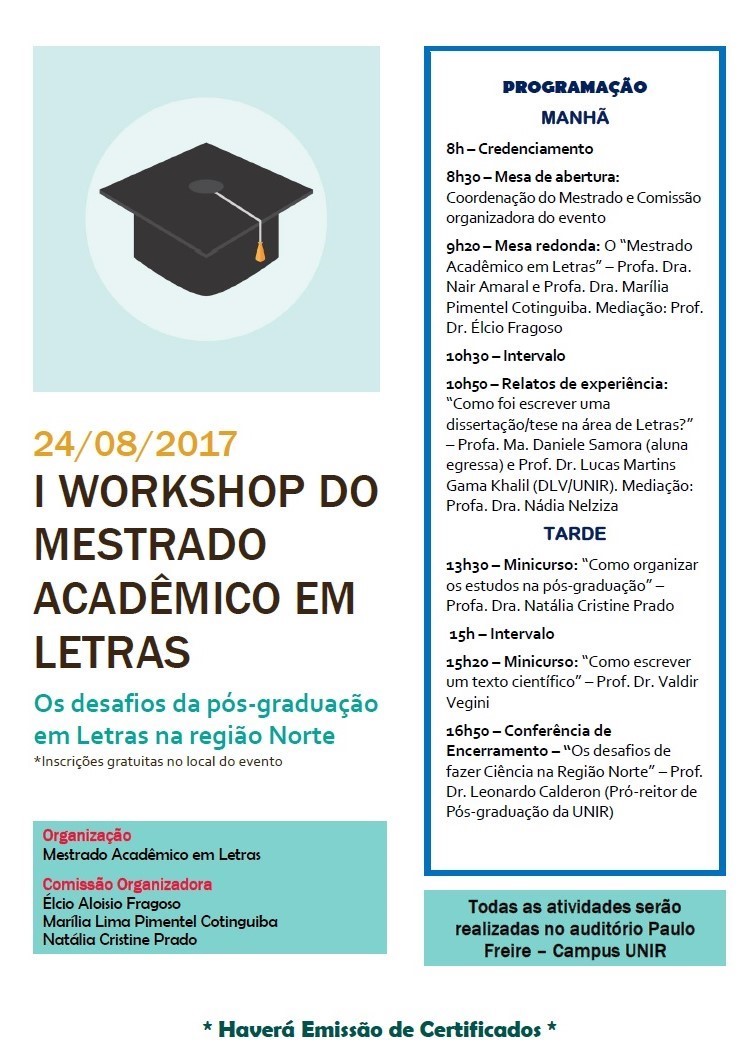Acontece no próximo dia 24 de agosto o I Workshop do Mestrado Acadêmico em Letras da Fundação Universidade Federal de Rondônia (UNIR), cujo tema é “Os desafios da pós-graduação em Letras na região Norte”. O evento será realizado no auditório Paulo Freire, no campus de Porto Velho, nos períodos da manhã e tarde.