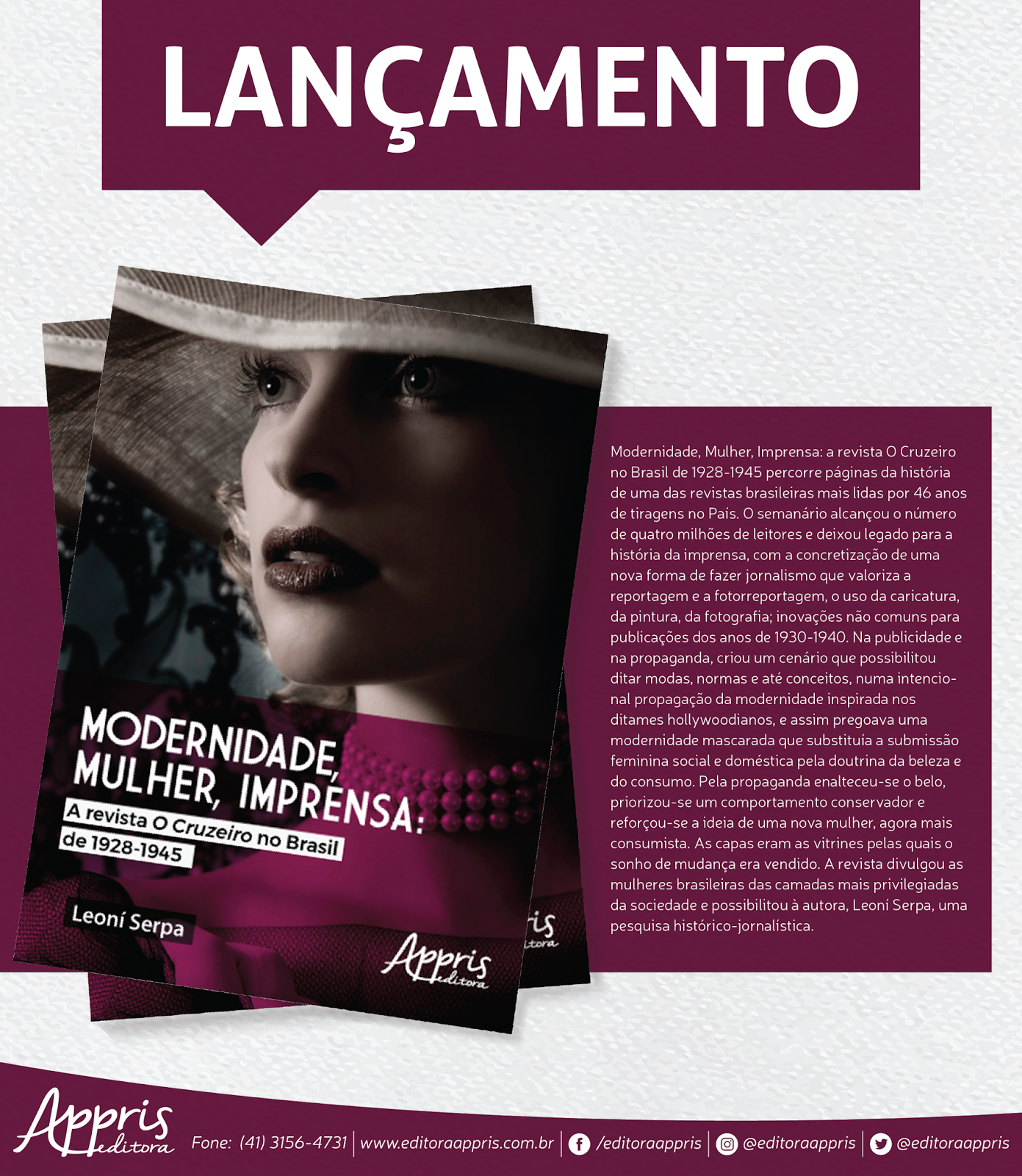 “Modernidade, Mulher, Imprensa: a revista O Cruzeiro no Brasil de 1928-1945” percorre páginas da história de uma das revistas brasileiras mais lidas por 46 anos de tiragens no País. O semanário alcançou o número de quatro milhões de leitores e deixou legado para a história da imprensa, com a concretização de uma nova forma de fazer jornalismo que valoriza a reportagem e a fotorreportagem, o uso da caricatura, da pintura, da fotografia; inovações não comuns para publicações dos anos de 1930-1940. Na publicidade e na propaganda, criou um cenário que possibilitou ditar modas, normas e até conceitos, numa intencional propagação da modernidade inspirada nos ditames hollywoodianos, e assim pregoava uma modernidade mascarada que substituía a submissão feminina social e doméstica pela doutrina da beleza e do consumo. Pela propaganda enalteceu-se o belo, priorizou-se um comportamento conservador e reforçou-se a ideia de uma nova mulher, agora mais consumista. As capas eram as vitrines pelas quais o sonho de mudança era vendido. A revista divulgou as mulheres brasileiras das camadas mais privilegiadas da sociedade e possibilitou à autora, Leoní Serpa, uma pesquisa histórico-jornalística.