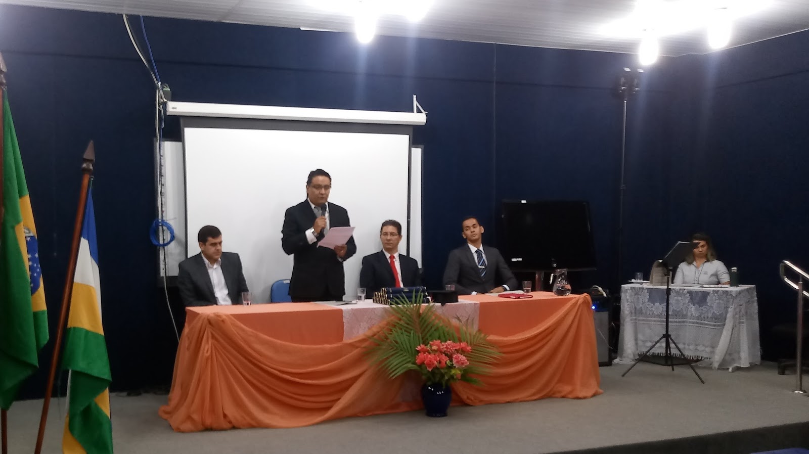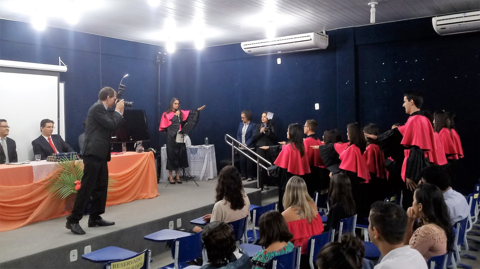 A sessão solene foi presidida pelo vice-reitor, professor doutor Marcelo Vergotti, que compôs a mesa ao lado do diretor do Campus de Vilhena, professor doutor Jorge Arturo Villena Medrano; do chefe do Departamento Acadêmico de Administração, professor mestre Ronie Peterson Silvestre; e do representante do Departamento Acadêmico de Ciências Contábeis, professor mestre Elder Gomes Ramos.