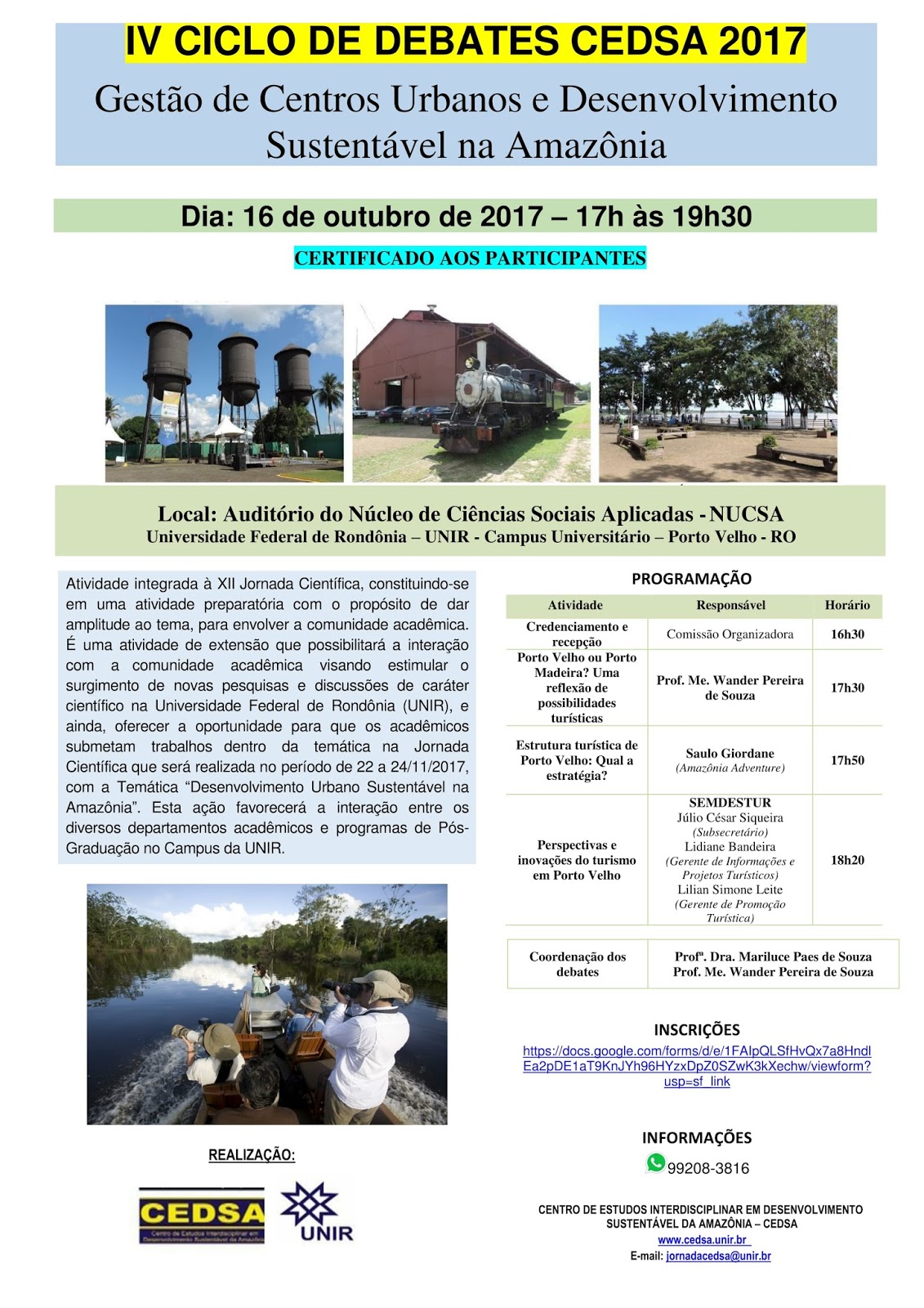 Estão abertas as inscrições para participação no IV Ciclo de Debates CEDSA 2017 – Gestão de Centros Urbanos e Desenvolvimento Sustentável na Amazônia, que será realizado no dia 16 de outubro de 2017, das 17h às 19h30, no Auditório do Núcleo de Ciências Sociais Aplicadas (NUCSA), no campus de Porto Velho da Fundação Universidade Federal de Rondônia (UNIR).