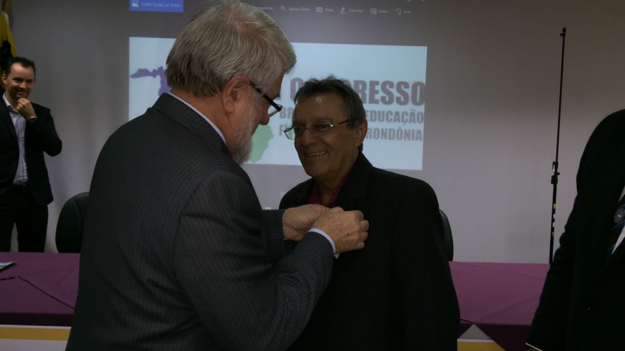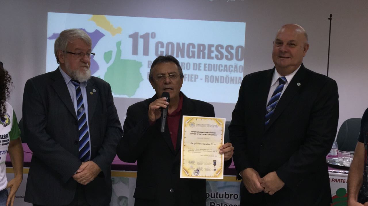 No último dia 26 de outubro, no Rondon Palace Hotel, durante a solenidade de abertura do 11º Congresso Brasileiro da FIEP Rondônia: Educação Física, Esporte e Saúde, o professor João Bernardino Neto, docente do Departamento Acadêmico de Educação Física da Fundação Universidade Federal de Rondônia (UNIR), recebeu menção honrosa e a Medalha Cruz de Prata “em reconhecimento ao seu serviço distinto e às contribuições notáveis para a Educação Física Internacional, o Desporto e a Ciência da Atividade Física”, pela Fédération Internationale d’Education Physique (FIEP).