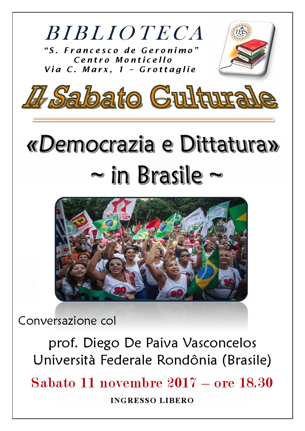 Democracia e Ditadura no Brasil é o tema da palestra que o professor Diego Vasconcelos, do Departamento de Ciências Jurídicas (DCJ) de Porto Velho da Universidade Federal de Rondônia (UNIR) desde 2013, vai proferir neste sábado, 11 de novembro, na Biblioteca Pública da cidade de Grotaglia, na Região da Puglia, na Itália.
