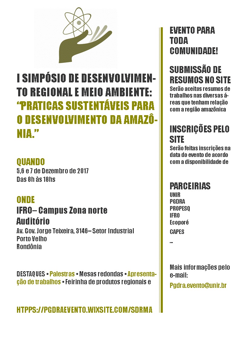 O Programa de Pós-Graduação em Desenvolvimento Regional e Meio Ambiente (PGDRA) da Fundação Universidade Federal de Rondônia (UNIR) realiza, com o apoio do Instituto Federal de Rondônia (IFRO), o I Simpósio de Desenvolvimento Regional e Meio Ambiente na Amazônia (SDRMA): Práticas Sustentáveis para o Desenvolvimento da Amazônia. O evento acontece de 5 a 7 de dezembro de 2017, no Auditório do Campus Zona Norte do IFRO, na Av. Gov. Jorge Teixeira, 3146, Setor Industrial, em Porto Velho.