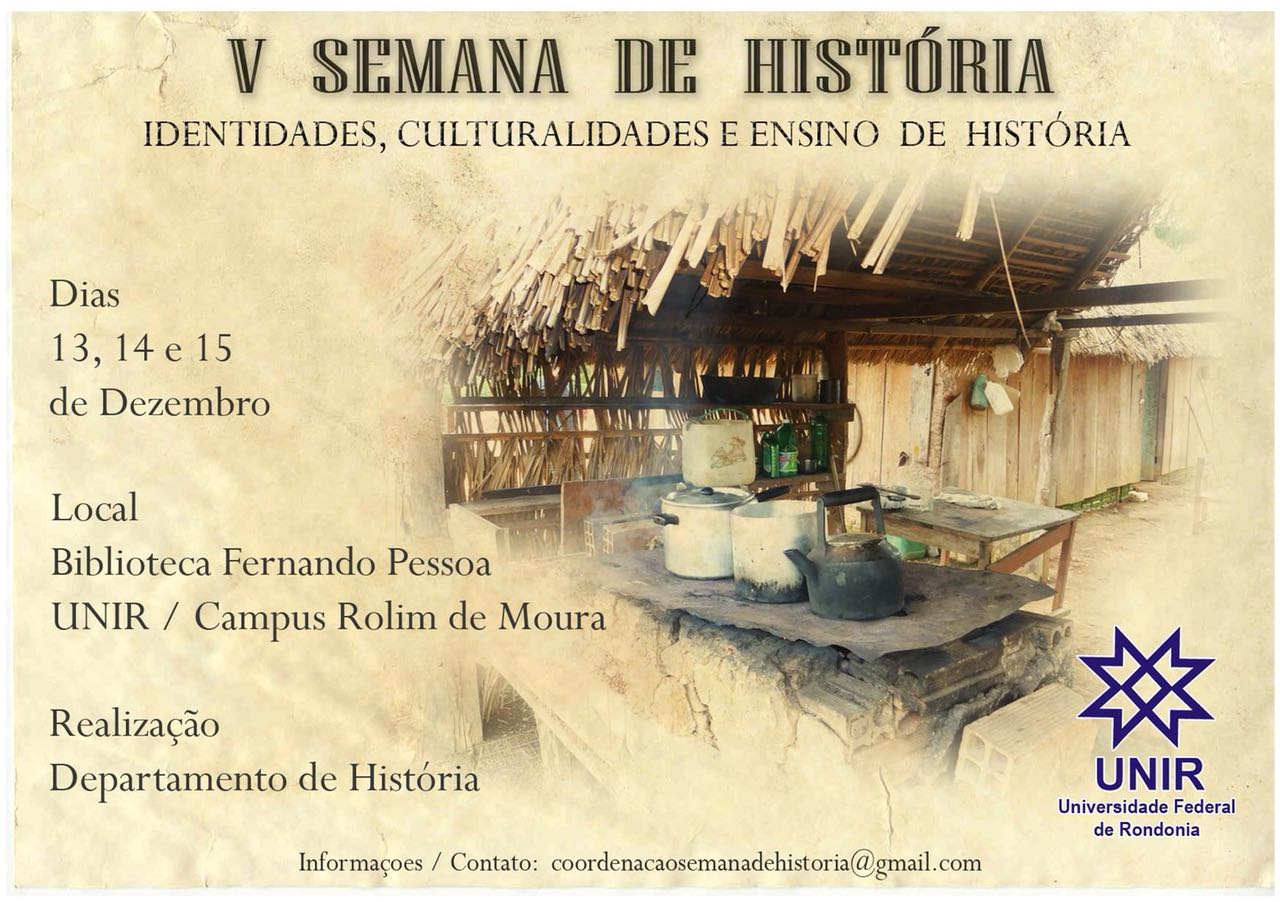 Será realizada entre os dias 13 e 15 de dezembro de 2017 a V Semana de História, promovida pelo Departamento de História do campus de Rolim de Moura da Fundação Universidade Federal de Rondônia, com o tema “Identidades, culturalidades e ensino de História”. O evento acontecerá na biblioteca do campus nos períodos matutino, vespertino e noturno.