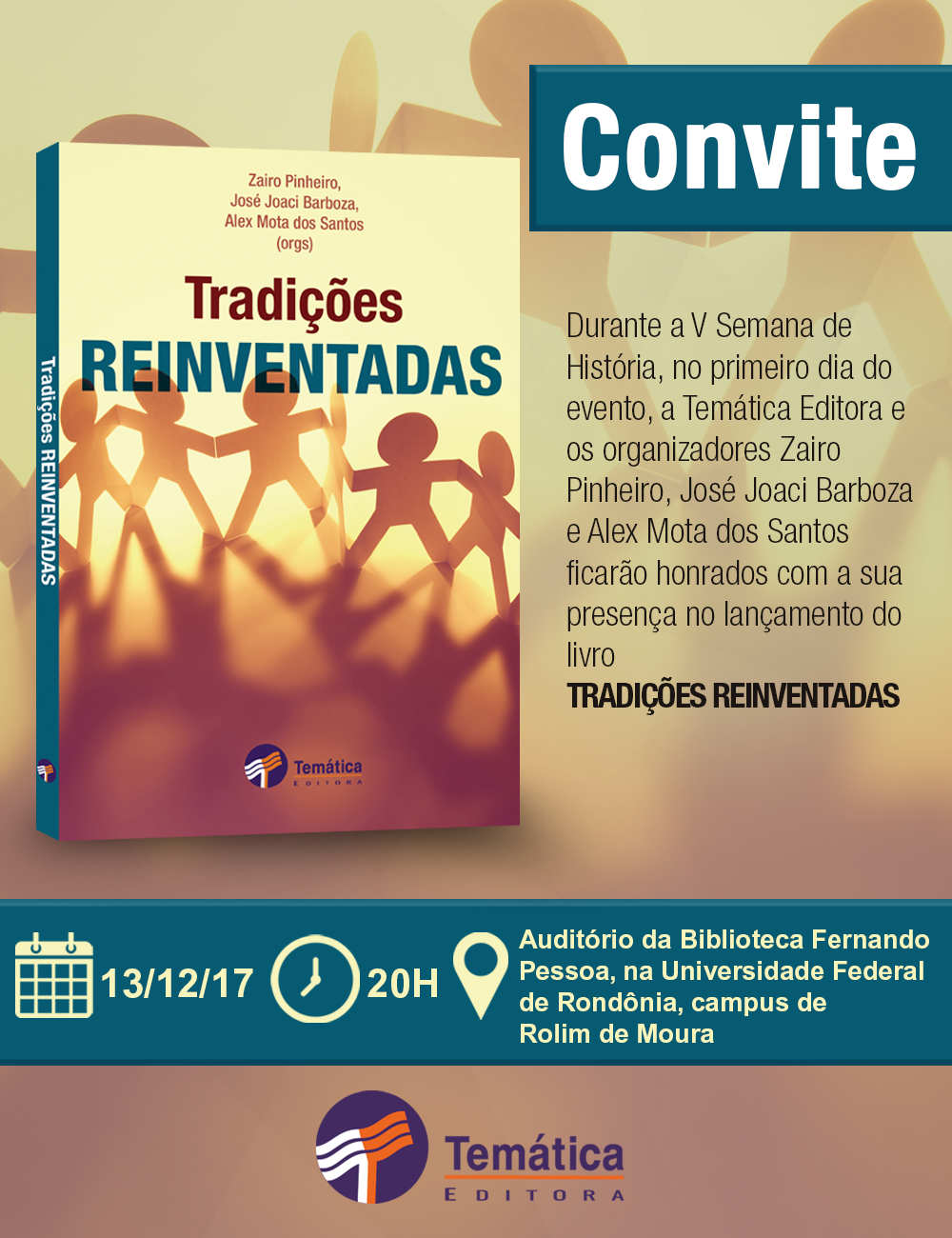 A obra Tradições Reinventadas será lançada no dia 13 de dezembro, às 20h, na biblioteca Fernando Pessoa, no campus de Rolim de Moura da Fundação Universidade Federal de Rondônia (UNIR). O evento de lançamento será realizado durante a V Semana de História, que acontece de 13 e 15 de dezembro de 2017.