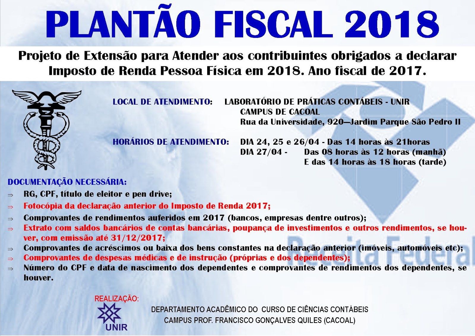 O Departamento de Ciências Contábeis da Fundação Universidade Federal de Rondônia (UNIR), Campus Professor Francisco Gonçalves Quiles (Cacoal), promoverá, no período de 24 a 27 de abril, a 11ª edição do Plantão Fiscal IRPF – 2018 para atender aos contribuintes (pessoa física) que obtiveram rendimentos tributáveis superiores a R$ 28.559,70 e que estejam obrigados a apresentar Declaração de Imposto de Renda Pessoa Física (DIRPF) em 2018.