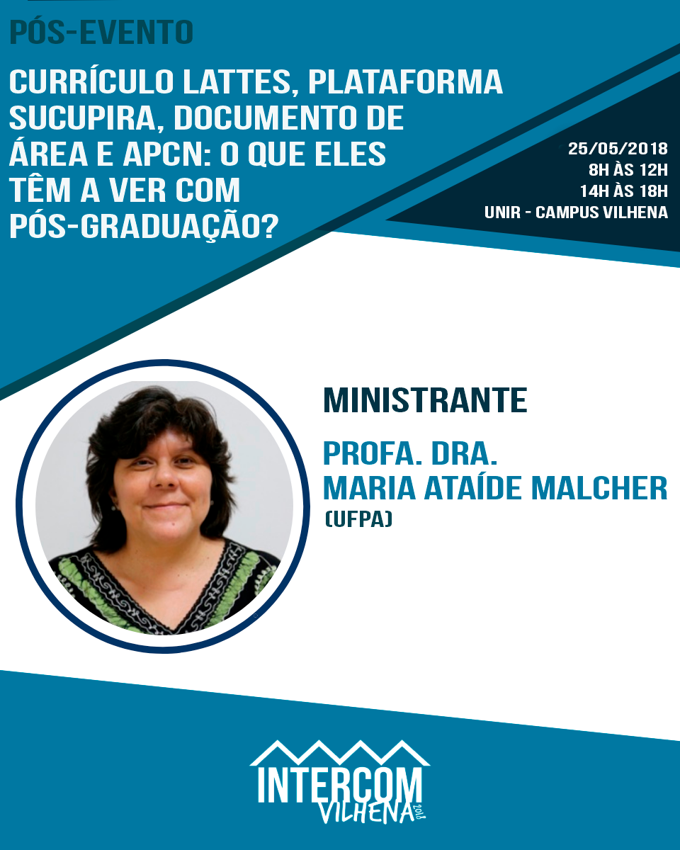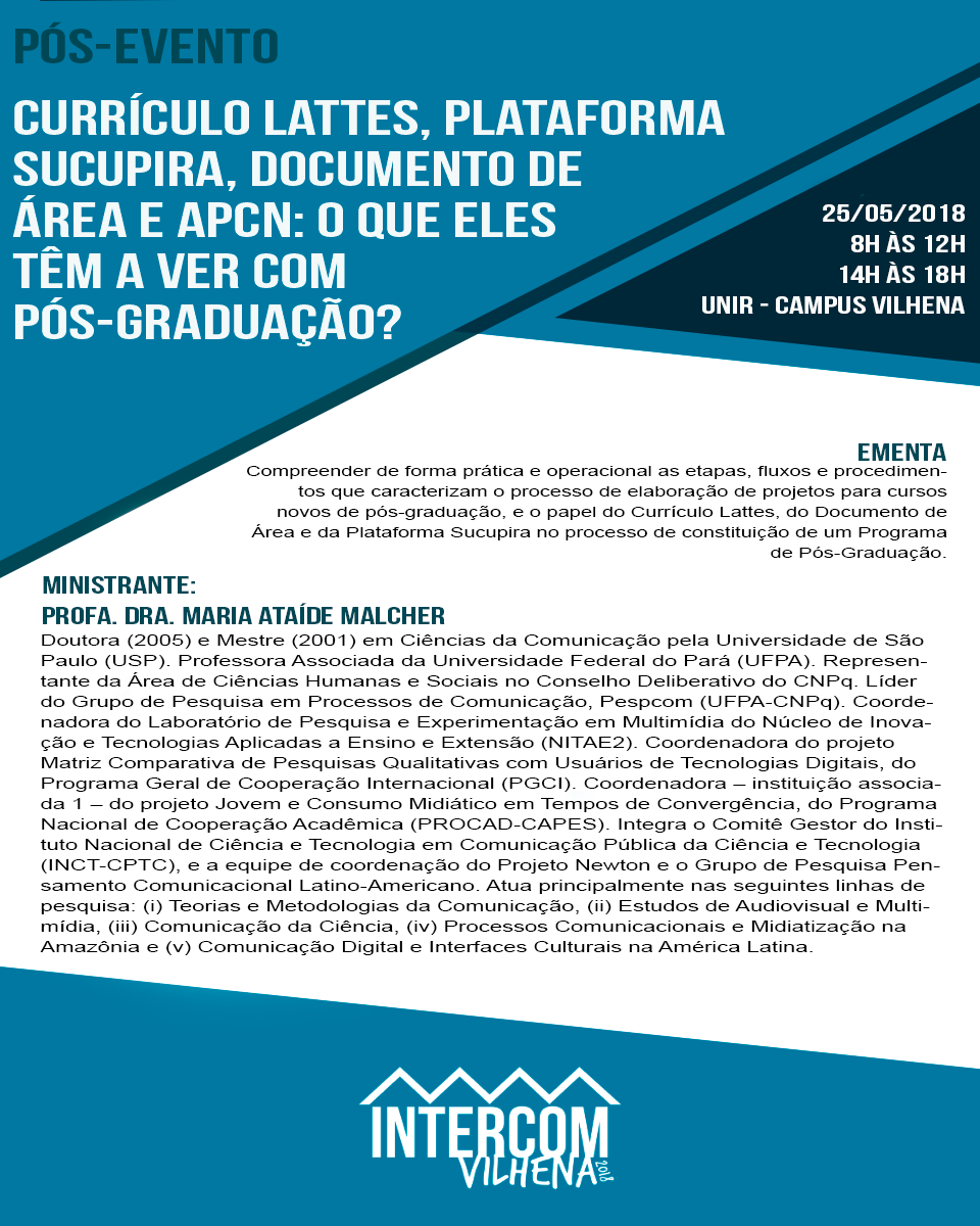 O Departamento de Jornalismo (Dejor) realizará no campus de Vilhena da Fundação Universidade Federal de Rondônia (UNIR), no dia 25 de maio, a oficina Currículo Lattes, Plataforma Sucupira, documento de Área e APCN: o que eles têm a ver com Pós-Graduação? A oficina é parte das atividades de pós-evento do XVII Congresso Regional Norte de Ciências da Comunicação, Intercom Norte 2018, que acontecerá entre os dias 22 e 24 de maio.