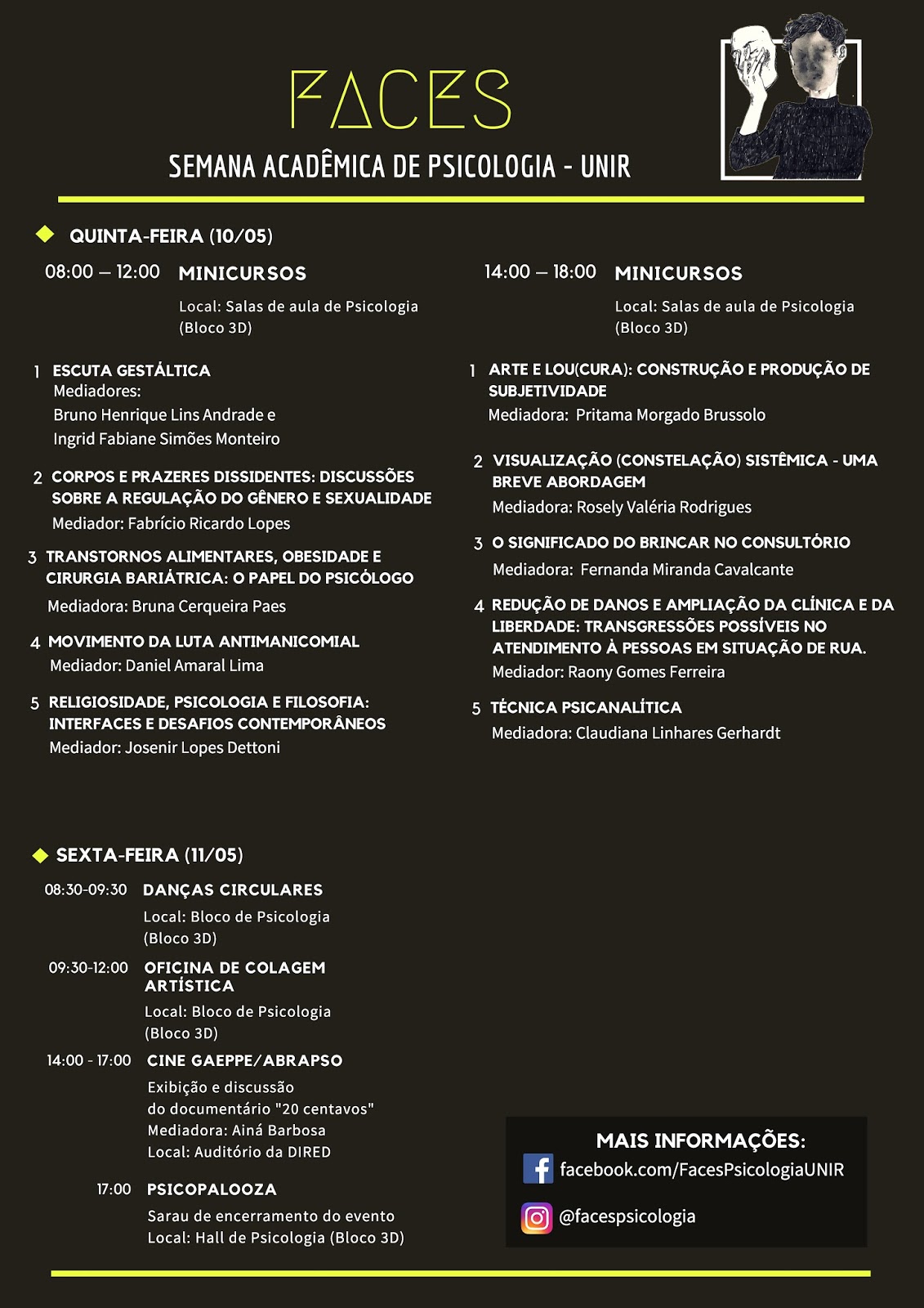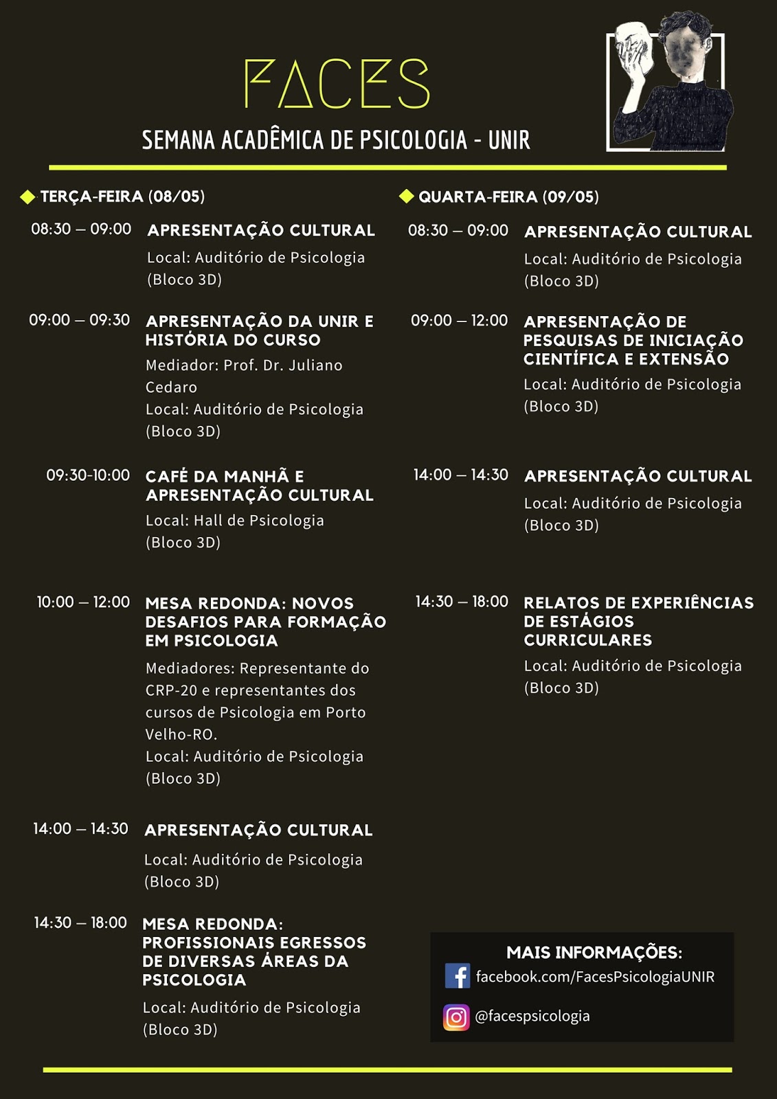 Mais informações podem ser obtidas por meio da página do evento no Facebook e no Instagram: https://www.facebook.com/FacesPsicologiaUNIR e @facespsicologia.