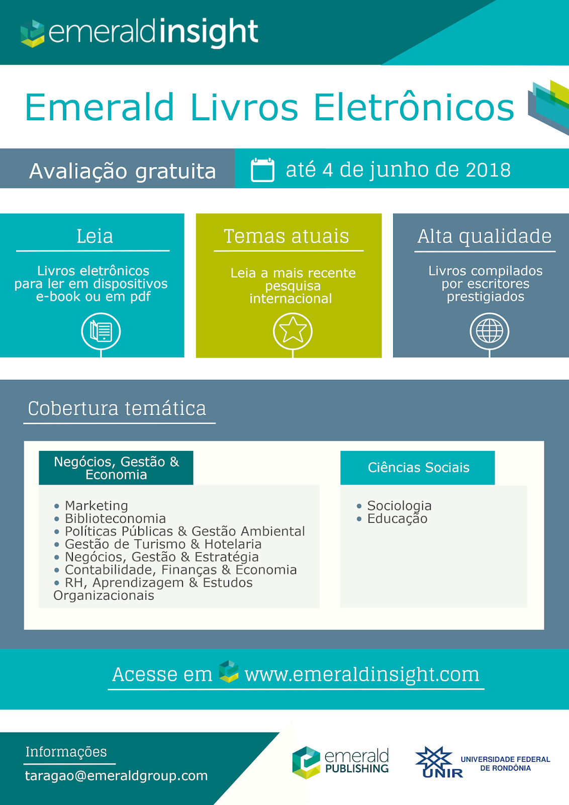 A Emerald Insight é uma editora global que une pesquisa e prática para benefício da sociedade. Até dia 4 de junho de 2018, disponibilizará acesso cortesia à sua coleção eletrônica para a UNIR.