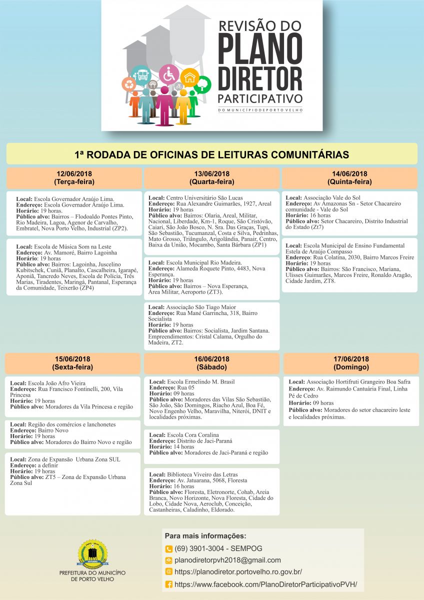 Em continuidade às atividades da Revisão do Plano Diretor Participativo do Município de Porto Velho (PDPM), a prefeitura realiza até o próximo dia 17 (domingo) oficinas de leituras comunitárias nos bairros de Porto Velho e localidades na Expansão Urbana. Os locais e horários de realização das oficinas estão disponíveis no banner abaixo.