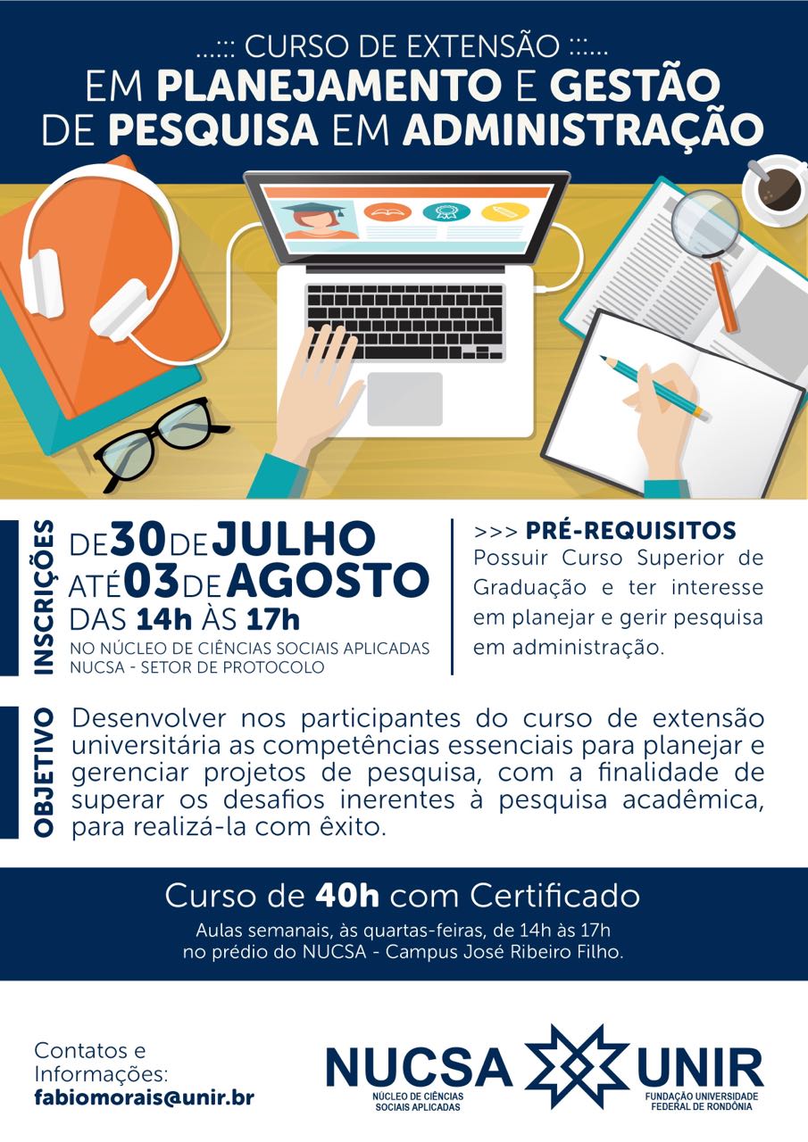 O Curso de Extensão Universitária em Planejamento e Gestão de Pesquisa em Administração, promovido pelo Departamento de Administração do Campus de Porto Velho da Fundação Universidade Federal de Rondônia (UNIR), está com inscrições abertas para participantes.