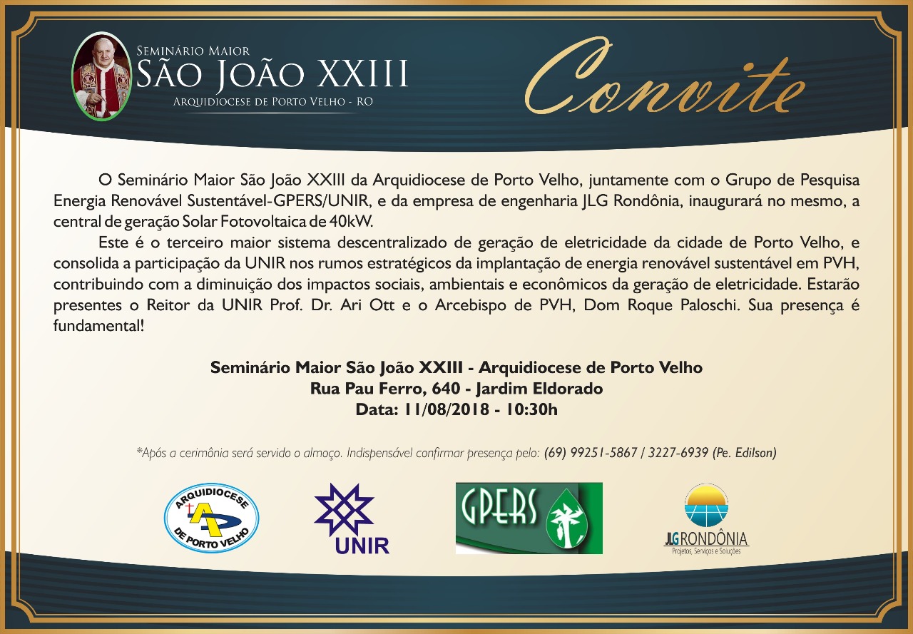 No próximo sábado, dia 11 de agosto, às 10h30, o Seminário Maior João XXIII da Arquidiocese de Porto Velho, juntamente com o Grupo de Pesquisa Energia Renovável Sustentável (GPERS) da Fundaçã Universidade Federal de Rondônia (UNIR) e a empresa de engenharia JLG Rondônia, fará a inauguração de uma central de geração solar fotovoltaica de 40 kW, no próprio Seminário, na Rua Pau Ferro, nº 640, Bairro Jardim Eldorado.