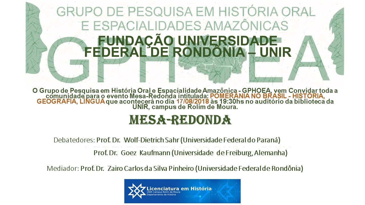 O Grupo de Pesquisa em História Oral e Espacialidades Amazônicas (GPGOEA), vinculado ao Departamento de História do Campus de Rolim de Moura da Fundação Universidade Federal de Rondônia (UNIR), realizará no próximo dia 17 de agosto, no auditório da Biblioteca Fernando Pessoa, a Mesa-Redonda: Pomerânia no Brasil: história, geografia e língua.
