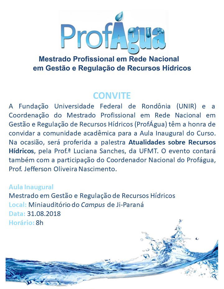 A Coordenação do Mestrado Profissional em Rede Nacional em Gestão e Regulação de Recursos Hídricos (ProfÁgua) da Fundação Universidade Federal de Rondônia (UNIR) realizará a Aula Inaugural do Curso no dia 31 de agosto de 2018, no Auditório da Biblioteca do Campus de Ji-Paraná, às 8 horas.