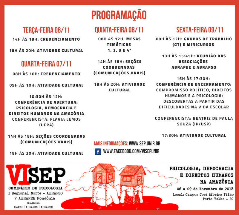 Devido às parcerias, o 6º SEP acontecerá simultaneamente ao I Encontro Regional Norte da ABRAPSO e do V Encontro Rondoniense de Psicologia Escolar/Educacional da ABRAPEE. O evento contará com conferências, mesas redondas, apresentação de grupo de trabalho, minicursos e comunicações orais.