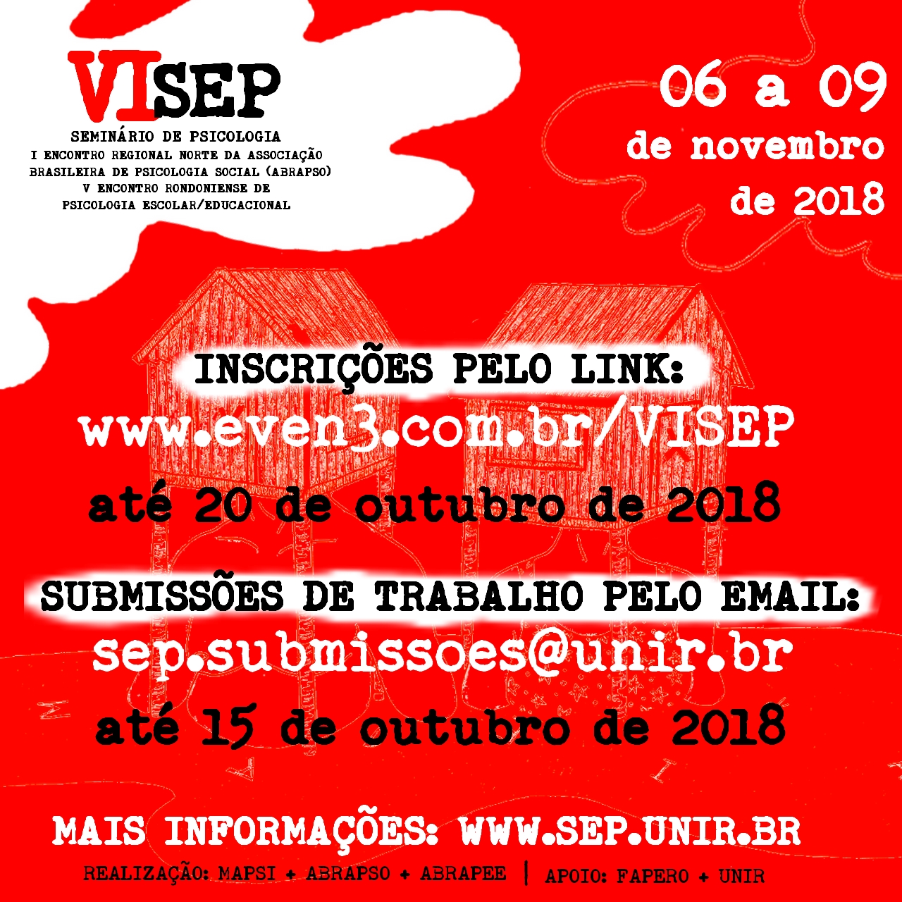 O 6º Seminário de Psicologia (SEP), promovido pelo Programa de Pós-Graduação em Psicologia (MAPSI) e pelo curso de graduação em Psicologia da Fundação Universidade Federal de Rondônia (UNIR), está com inscrições abertas para submissão de trabalhos até dia 30 de setembro de 2018 e para participação como ouvinte até 20 de outubro de 2018.