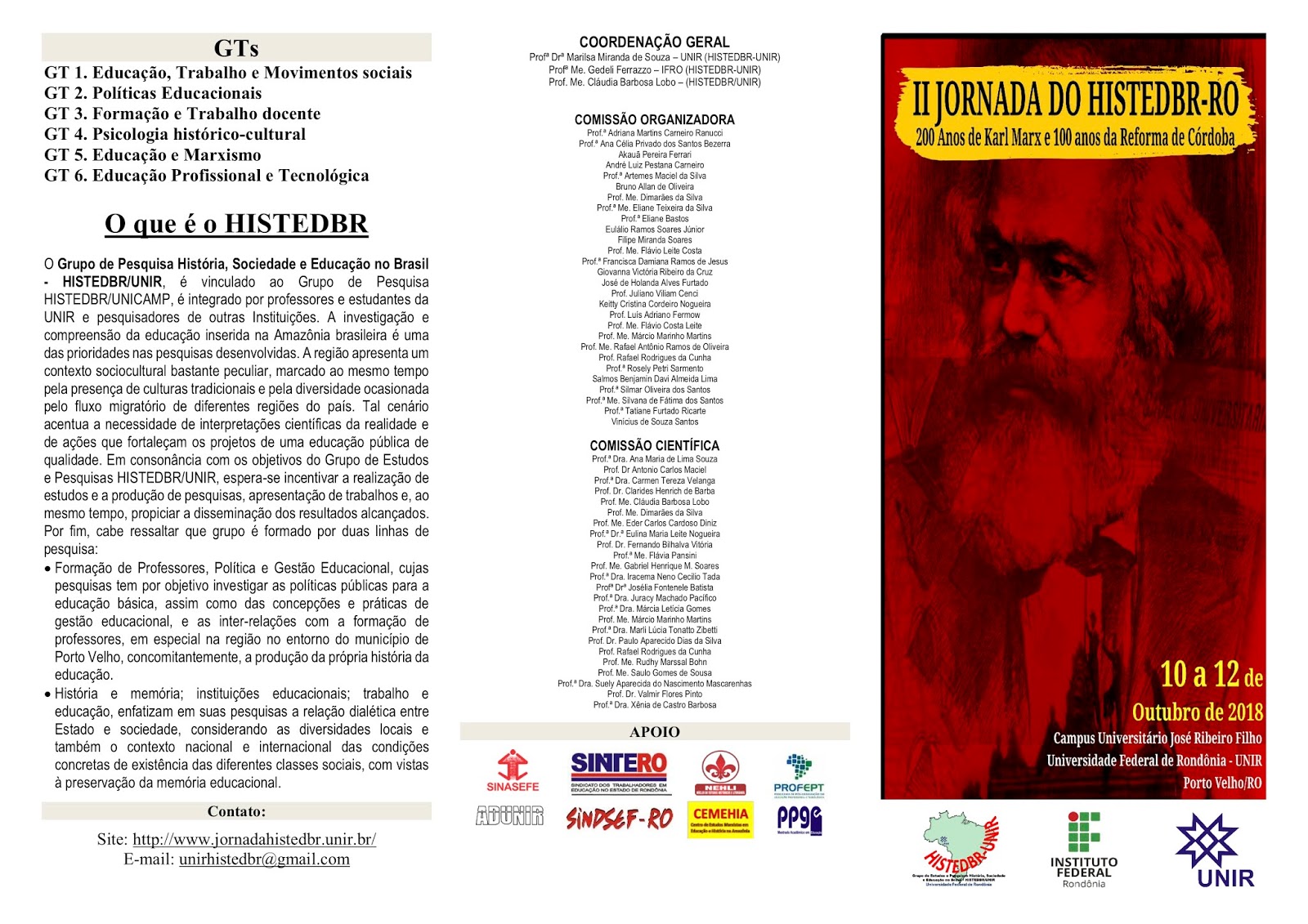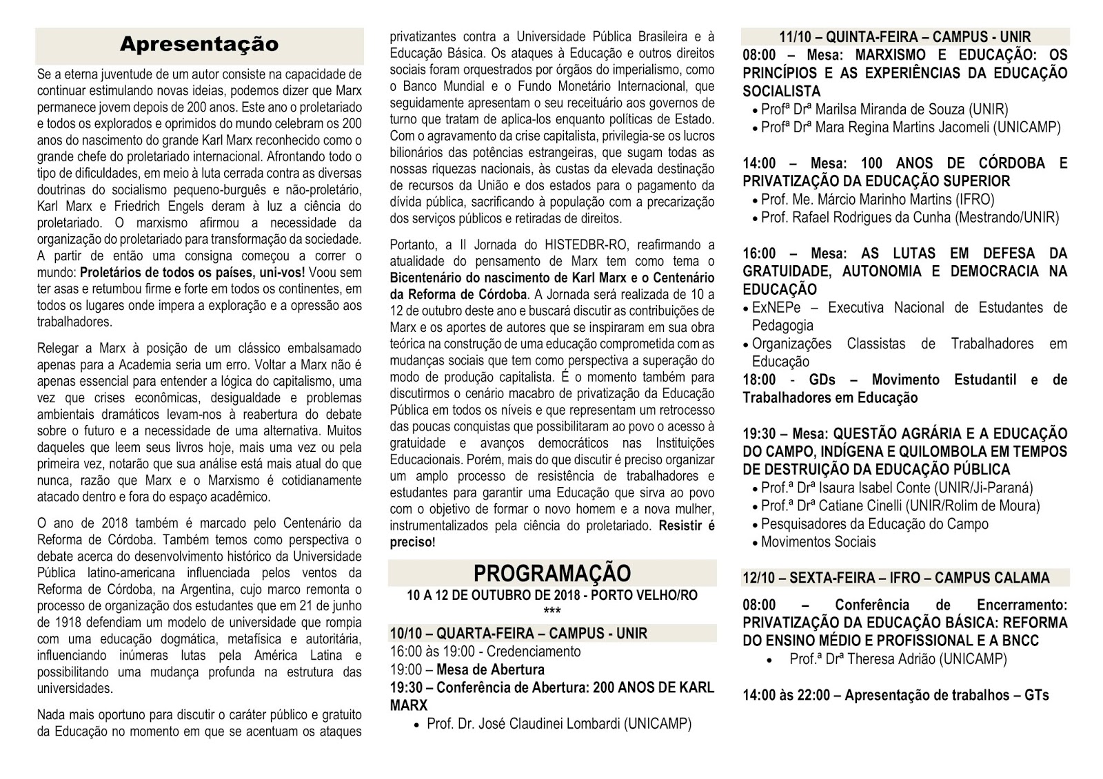 No período de 10 a 12 de outubro de 2018 ocorrerá a II Jornada do HISTEDBR-RO, grupo de Pesquisa da Fundação Universidade Federal de Rondônia (UNIR), que tem como temática central: 200 anos de Karl Marx e 100 anos da Reforma de Córdoba.