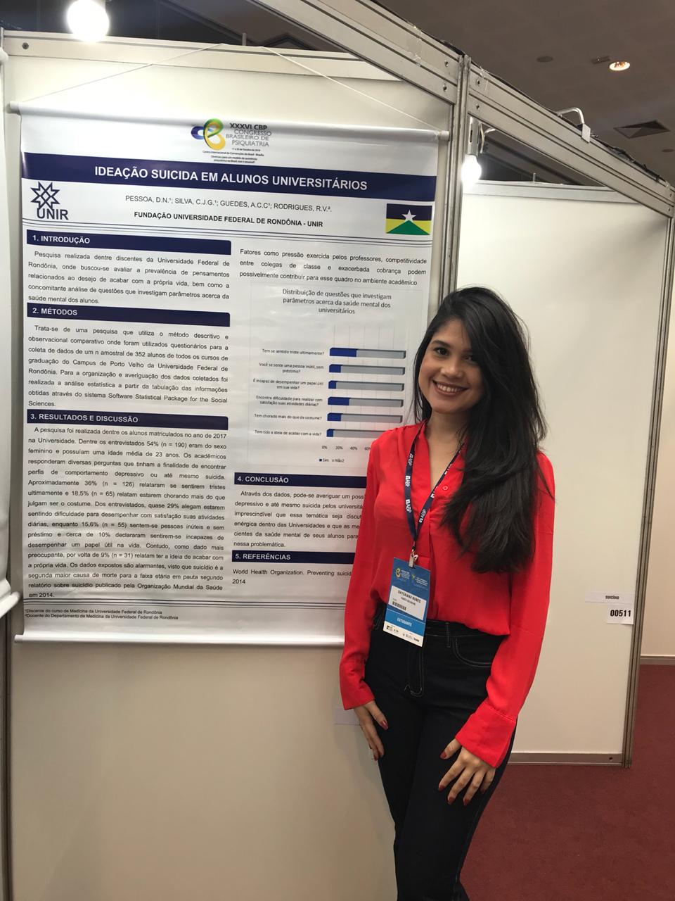 Uma professora e duas alunas do Curso de Medicina da Fundação Universidade Federal de Rondônia (UNIR) tiveram trabalhos aprovados e apresentados no XXXVI Congresso Brasileiro de Psiquiatria (CBP), realizado de 17 a 20 de outubro, em Brasília, pela Associação Brasileira de Psiquiatria. Dentro os quatro trabalhos apresentados pela equipe da UNIR no evento, um ficou entre os oito melhores na sua categoria.