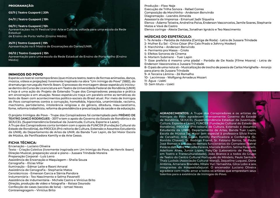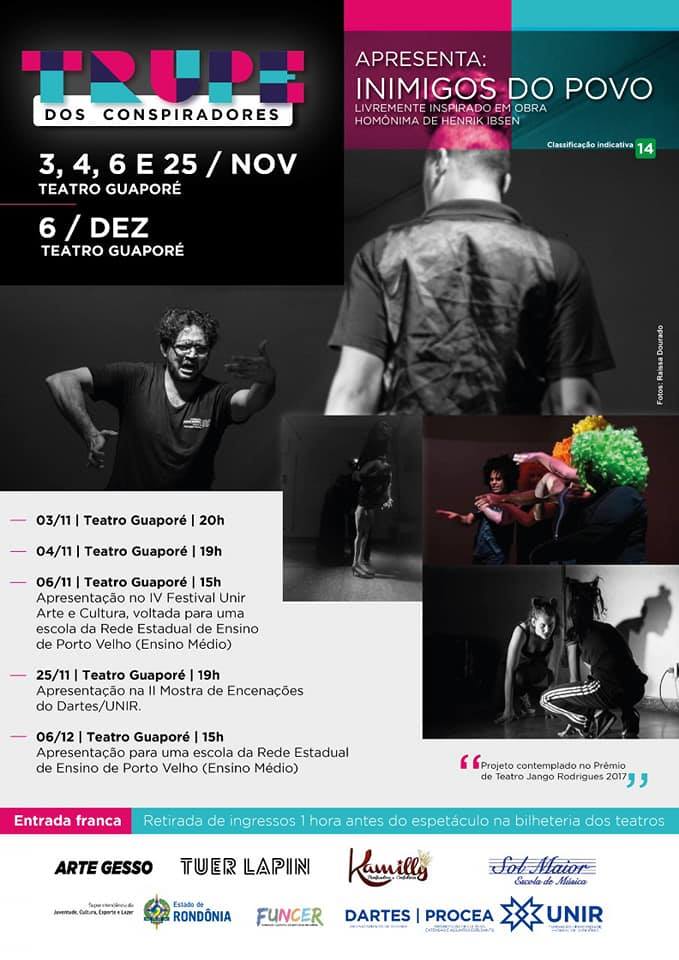 O espetáculo Inimigos do Povo - Trupe dos Conspiradores, livremente inspirado na obra Um Inimigo do Povo, de Henrik Ibsen, foi contemplado pelo Prêmio de Teatro Jango Rodrigues – 2017 e tem o apoio do Governo do Estado de Rondônia e da SEJUCEL.