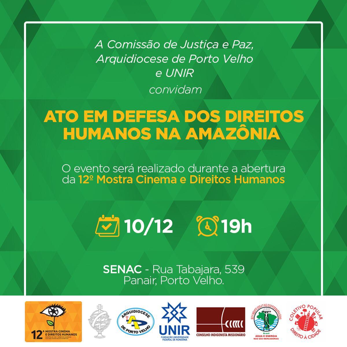 Na próxima segunda-feira (10), na abertura 12ª Mostra Cinema e Direitos Humanos, a Fundação Universidade Federal de Rondônia (UNIR) e Comissão de Justiça e Paz da Arquidiocese de Porto Velho provem um “Ato em defesa dos direitos humanos na Amazônia”. A cerimônia será realizada no auditório do SENAC, na Rua Tabajara, 539 - Panair, em Porto Velho.