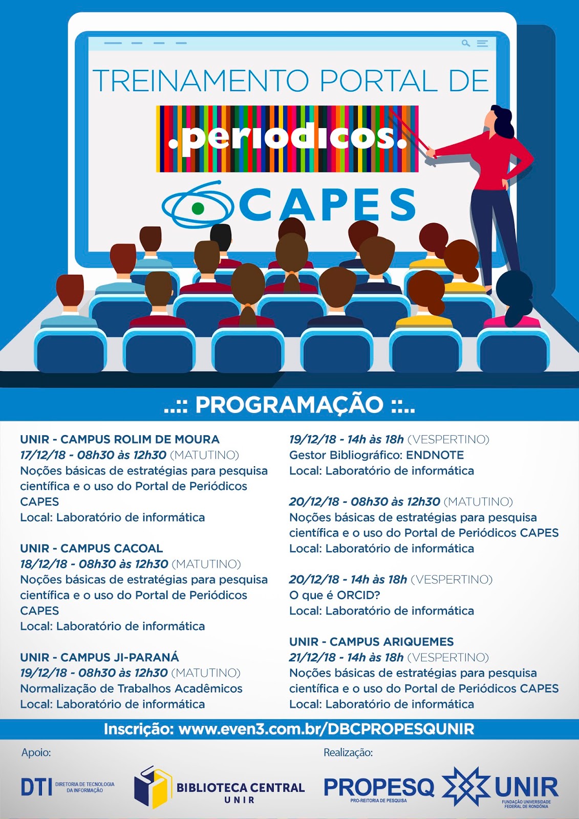 A Pró-Reitoria de Pós-graduação e Pesquisa (PROPesq), em parceria com a Biblioteca Central e outros setores da Fundação Universidade Federal de Rondônia (UNIR), promoverá nos dias 17 a 21 de dezembro, um treinamento especial voltado para a utilização do Portal de Periódicos da Coordenação de Aperfeiçoamento de Pessoal de Nível Superior (Capes). A ação será desenvolvida nos Campi da UNIR em Cacoal, Rolim de Moura, Ji-Paraná e Ariquemes.
