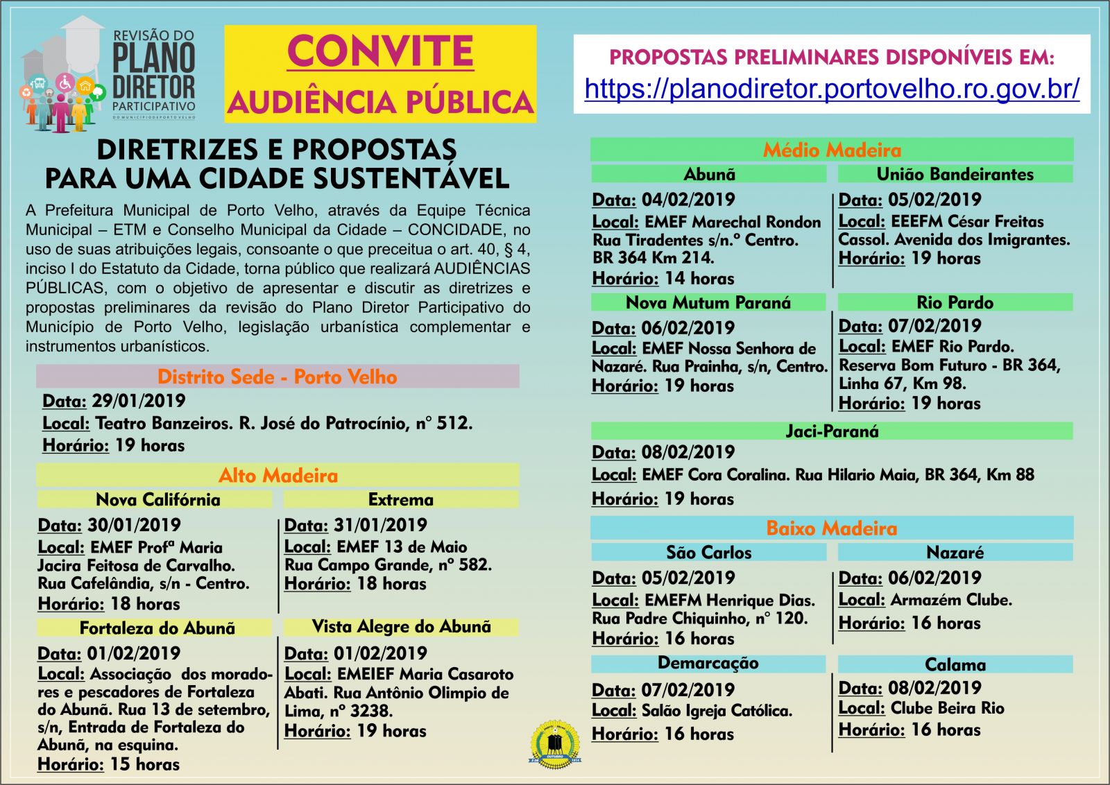 A 2ª Rodada de Audiências Públicas será promovida pela Prefeitura Municipal de Porto Velho, com início programado para o dia 29 de janeiro no Distrito Sede - Porto Velho e seguirá sua programação nos demais Distritos até o dia 8 de fevereiro de 2019, conforme agenda disponível no arquivo abaixo.