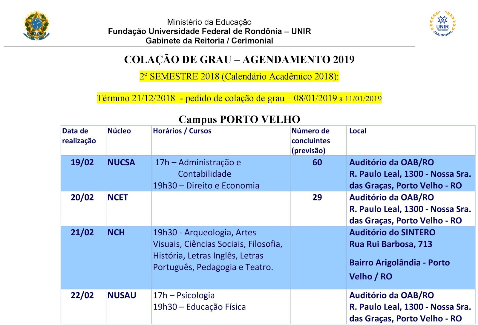 A Fundação Universidade Federal de Rondônia (UNIR) realizou na semana passada, nos dias 13 e 14 de fevereiro de 2019, as Sessões de Colação de Grau Solene Integradas dos alunos concludentes dos campi de Ariquemes e Rolim de Moura, respectivamente.