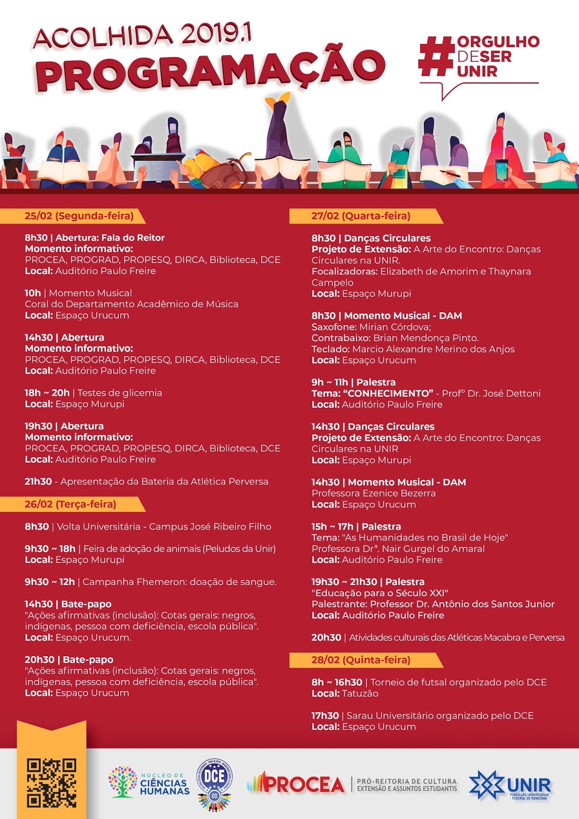 De 25 a 28 de fevereiro de 2019, a Fundação Universidade Federal de Rondônia (UNIR) promove, por meio da Pró-Reitoria de Cultura, Extensão e Assuntos Estudantis (PROCEA), a Semana de Acolhimento dos Discentes 2019/1. As atividades serão realizadas no Campus José Ribeiro Filho, em Porto Velho.