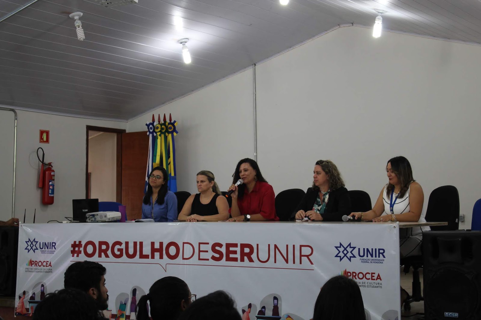 Na ocasião, a mesa de trabalhos foi composta, além do reitor, pela pró-reitora da PROCEA, Marcele Pereira, pelas representantes da PROGRAD, Verônica Cordovil, e da PROPESQ, Aline Vasconcelos, pela diretora da Biblioteca Central, Eliane Barros, e pela coordenadora geral do DCE, Poliana Maiara.