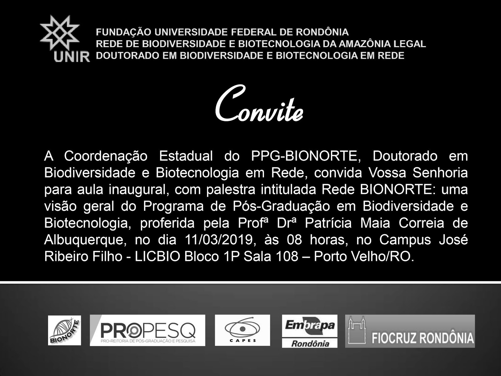A coordenação estadual do Doutorado em Biodiversidade e Biotecnologia em Rede (PPG-BIONORTE) convida acadêmicos e demais interessados para sua aula inaugural, programada para segunda-feira, 11, às 8h, no Laboratório de Ictiologia e Pesca (LICBIO), localizado no Bloco 1P, Sala 108 do Campus José Ribeiro Filho, em Porto Velho. .