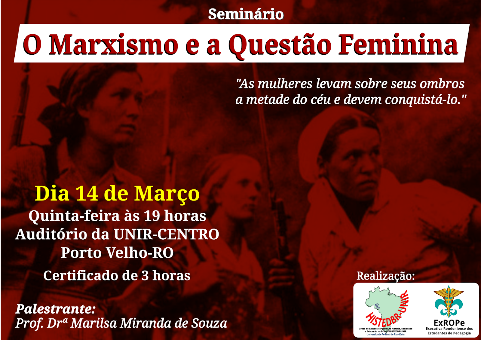 O Grupo de Estudos e Pesquisas. "História, Sociedade e Educação no Brasil" (HISTEDBR/UNIR) e a Executiva Rondoniense de Estudantes de Pedagogia (ExROEPe) realizam na próxima quinta-feira, 14, às 19h, no Auditório da UNIR-CENTRO, o Seminário MARXISMO E QUESTÃO FEMININA, que terá a palestra da Professora Doutora Marilsa Miranda de Souza, do Programa de Pós-Graduação Stricto Sensu em Educação da Fundação Universidade Federal de Rondônia (PPGE/UNIR), seguida de debate acerca da relação entre a teoria Marxista e Questão Feminina.